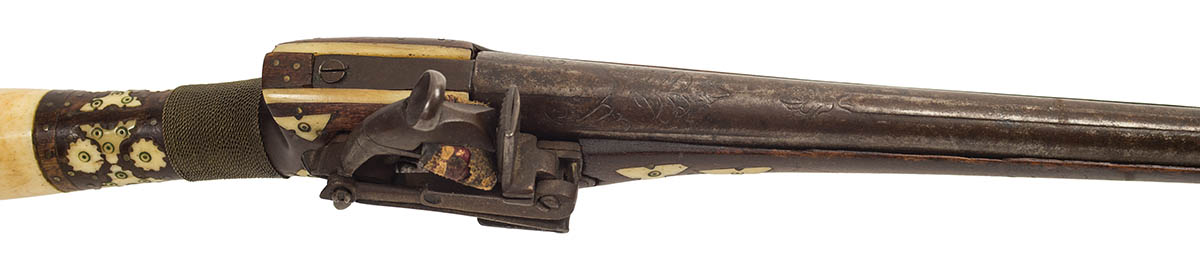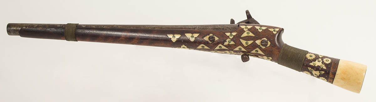 Engraved tapered barrel, and inlaid bone and brass tack decoration on the stock, 19 1/8″ l.