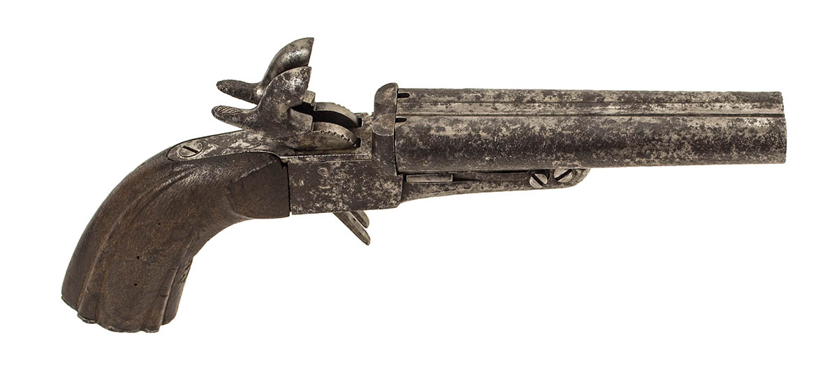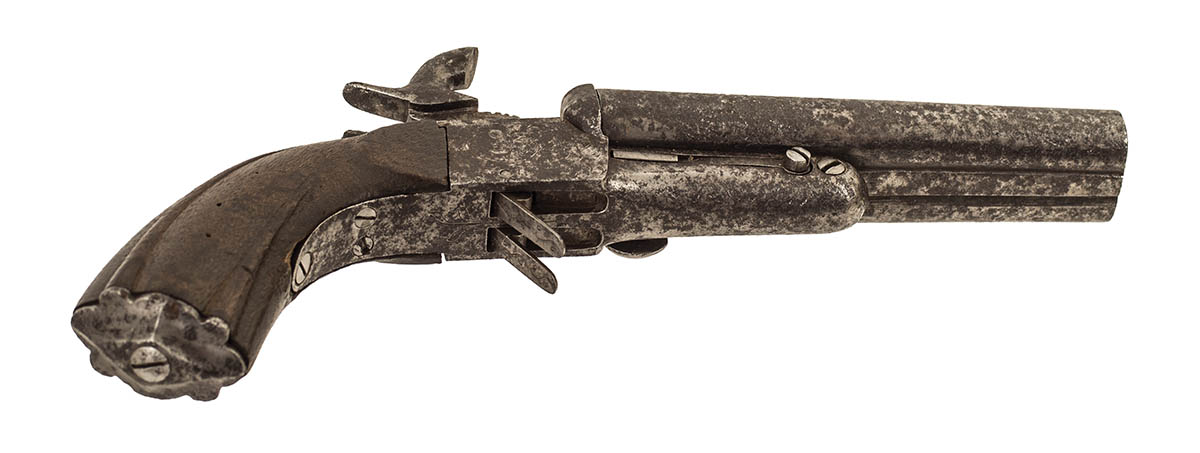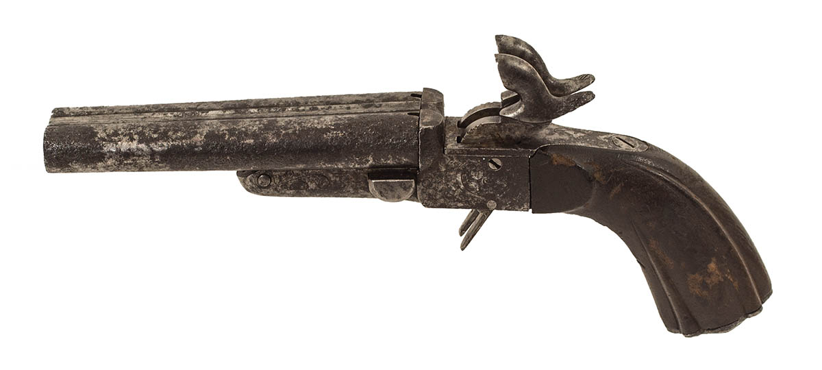 Double barreled rifled Pinfire, with retractable triggers, lightly engraved, with wear, fully functionable, 9 1/2″ l.