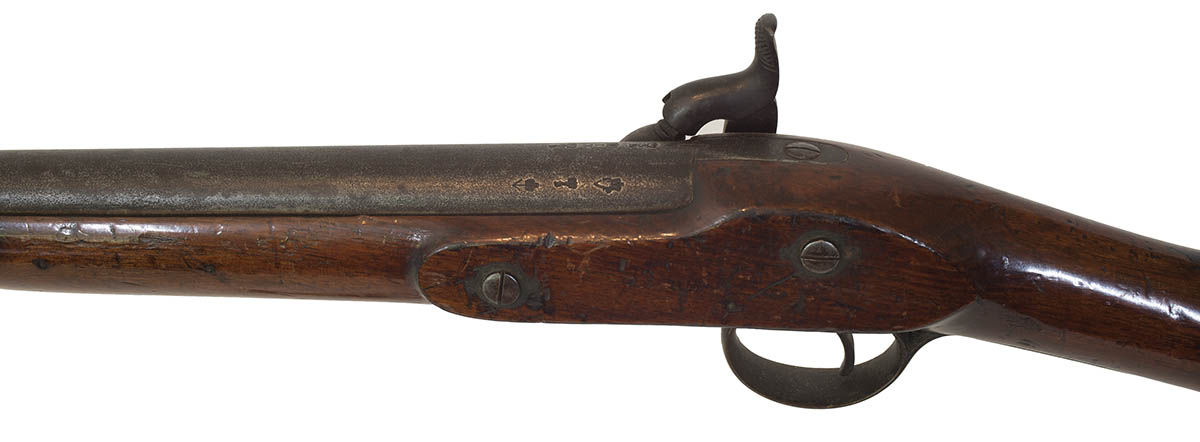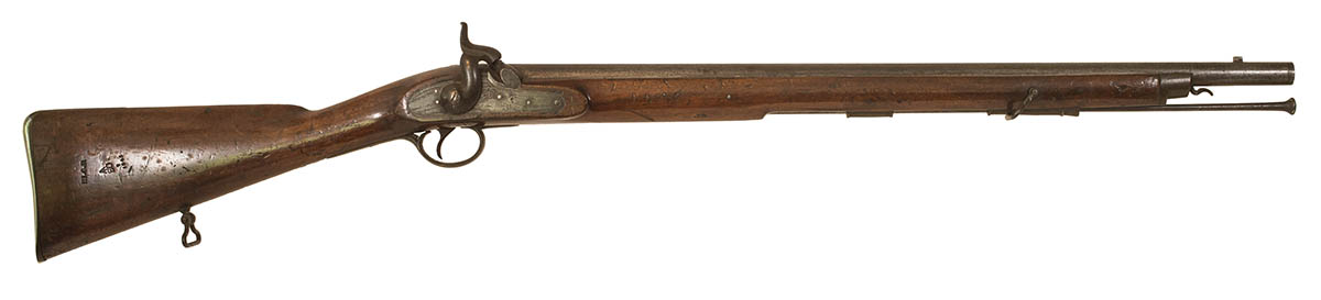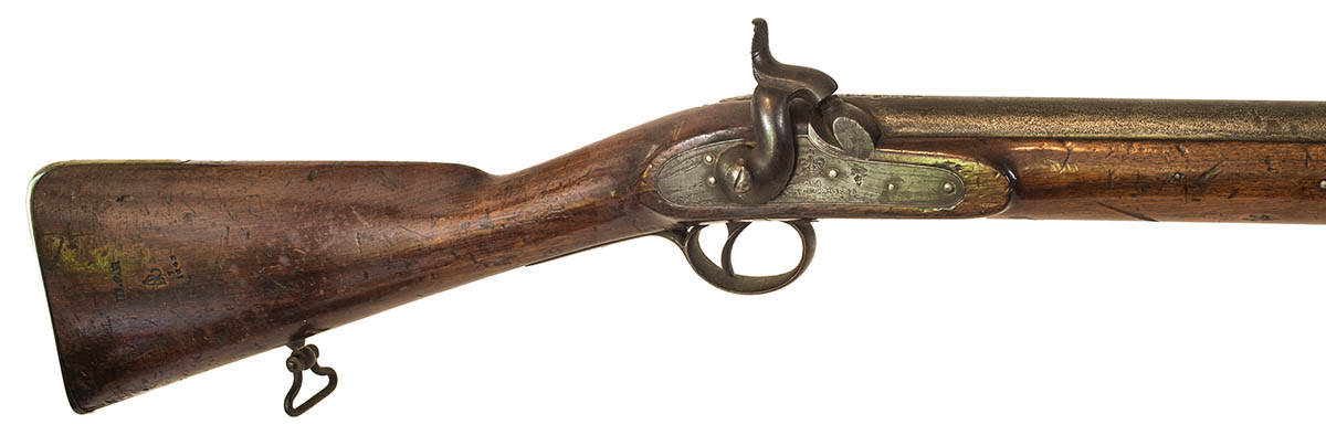 Smooth bore, “Crown V R Tower 1843”, with numerous stamps on barrel and stock, engraved “2508, C, 3124” on top of butt plate, “H.E. Brown” marked on bottom, original ramrod, 42 1/2″ l.