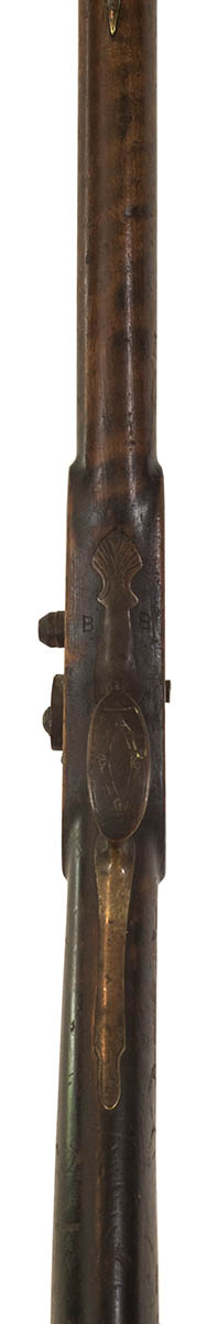 N.E. Fowling Gun, conversion, “Warren, Albany”, with worn engraving on brass, “BB” stamped on underside of stock, replaced ramrod, stock damage at end of barrel and wear, 64 1/4″ l.