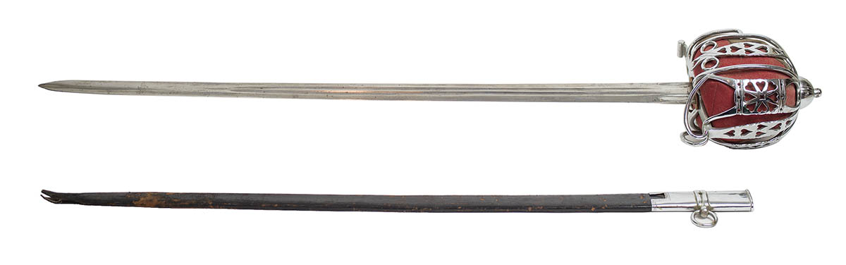Turn-of-the-century, basket hilt sword, with a red leather liner and wrapped sharkskin grip, metal and leather scabbard with wear, 37 1/2″ l.