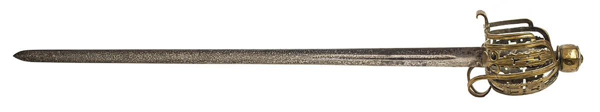 Early brass basket hilt sword, with a leather grip, 38 1/4″ l.