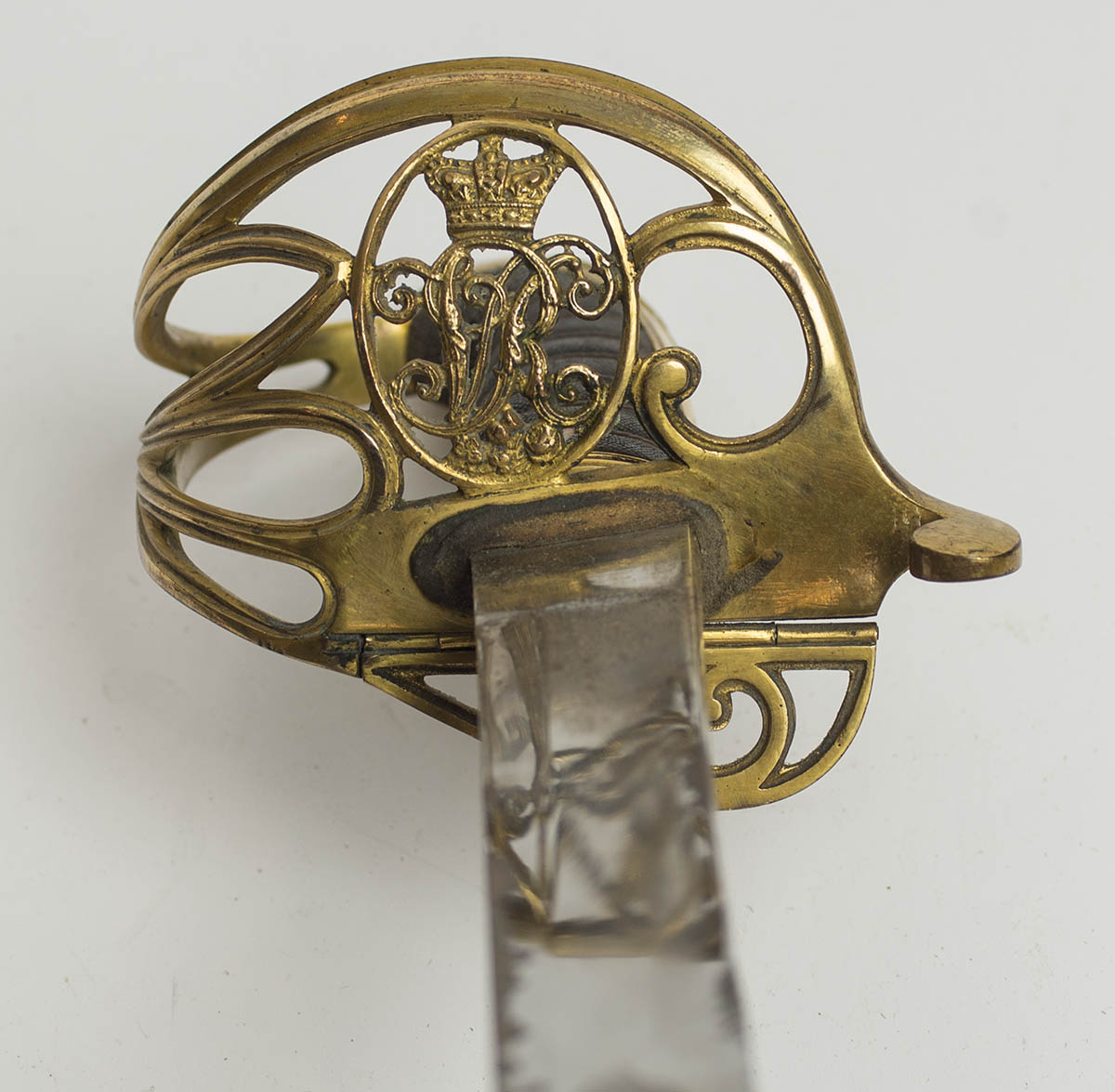 Model 1836 sword, with some worn etching on the blade, some engraving on the hilt and scabbard, crown and initials cast in guard which has one side (38 1/4″ l) that folds, sharkskin grip, metal “pinecone” bullion dress knot, end of scabbard is missing, rust areas on blade, wear.