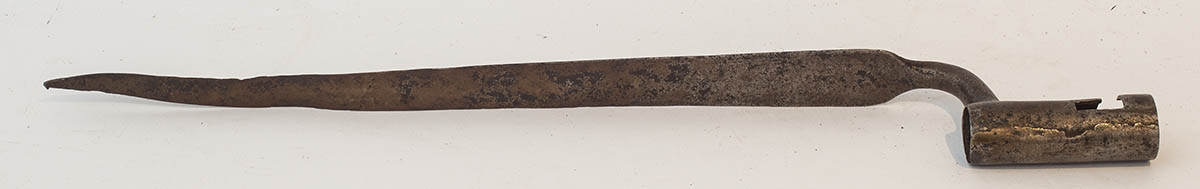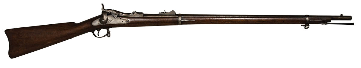 “U.S. Springfield, US Model 1878″ trap door rifle, made in 1884, serial #281069, numerous stamped marks on barrel, nice cartouche, decent bore, 51 3/4” l, with bayonet.