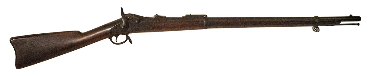 “U.S. Springfield, US Model 1884” trap door rifle, serial #564245, lightly carved “initials and 1893″ in side of stock, stock has a tight crack on one side, and wear, 30% original finish, Buffington sight, decent bore, 48 3/4” l.