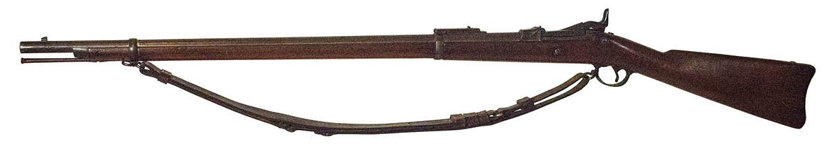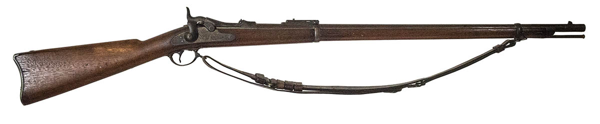 “U.S. Springfield, US Model 1884” trap door rifle, serial #307890, “V, P, Eagle Head, P” stamps on barrel, stamped “18” on top of stock near butt plate, leather strap included, light wear, cleanable bore (sling is WWI), no cartouche, Buffington sight, 51 3/4″ l.