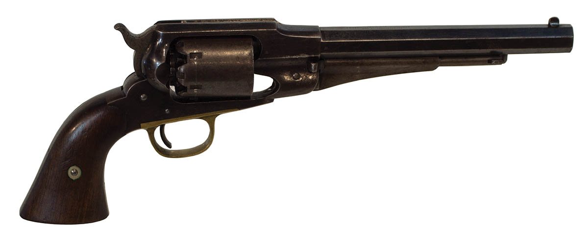 Remington new model army revolver, .44 caliber antique percussion, stamped on barrel “Patented Sept. 14, 1858, E. Remington & Sons, Ilion, New York, U.S.A., New Model”, stamped serial number on barrel “60803”, cylinder stamped “A, W”, trigger guard stamped “C”, grips also stamped “C”, one grip is stamped with two seriphed initials, with wear, crisp inspector marks, 60% bright finish.