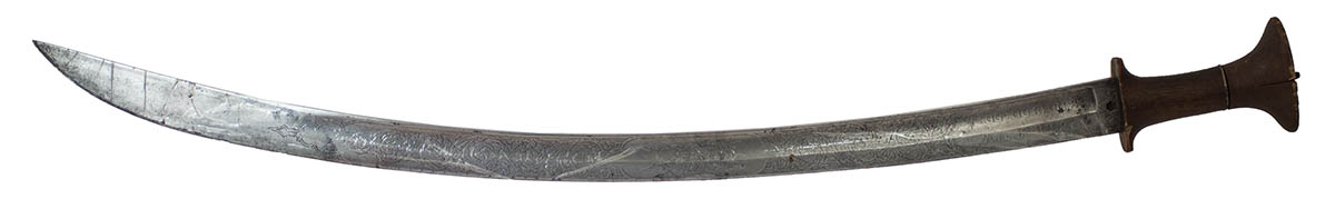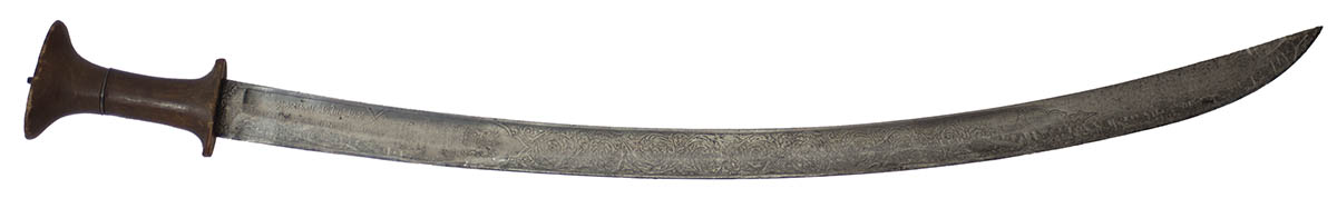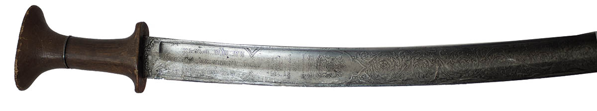 Superbly etched blade, made by Wilkinson Sword of London, England, “Sword Makers to H.M. King Edward VII” (1901-1910), for use in Persia (Middle East), grip exhibits wear, blade is protected by plastic wrap, 34 3/4″ l.