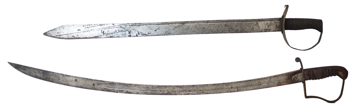Both with leather handled grips with wear, one has a straight blade with a 2 1/2″ wide, light metal guard, painted green, 31 3/4″ l; the other curved blade sword, possibly British, Austrian artillery sword, 37 1/4″ l.