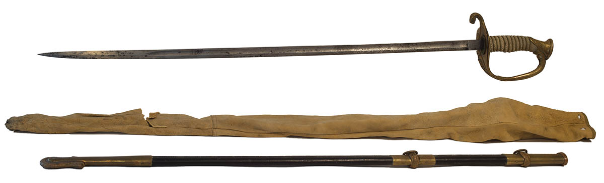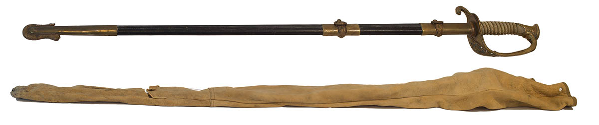 “F.J. Heiberger, Washington, D.C.”, Heiberger was in business from 1858-1900, etched blade, brass “USN, Dolphin Hilt” with sharkskin grip, brass and leather scabbard, 35 1/2″ l.