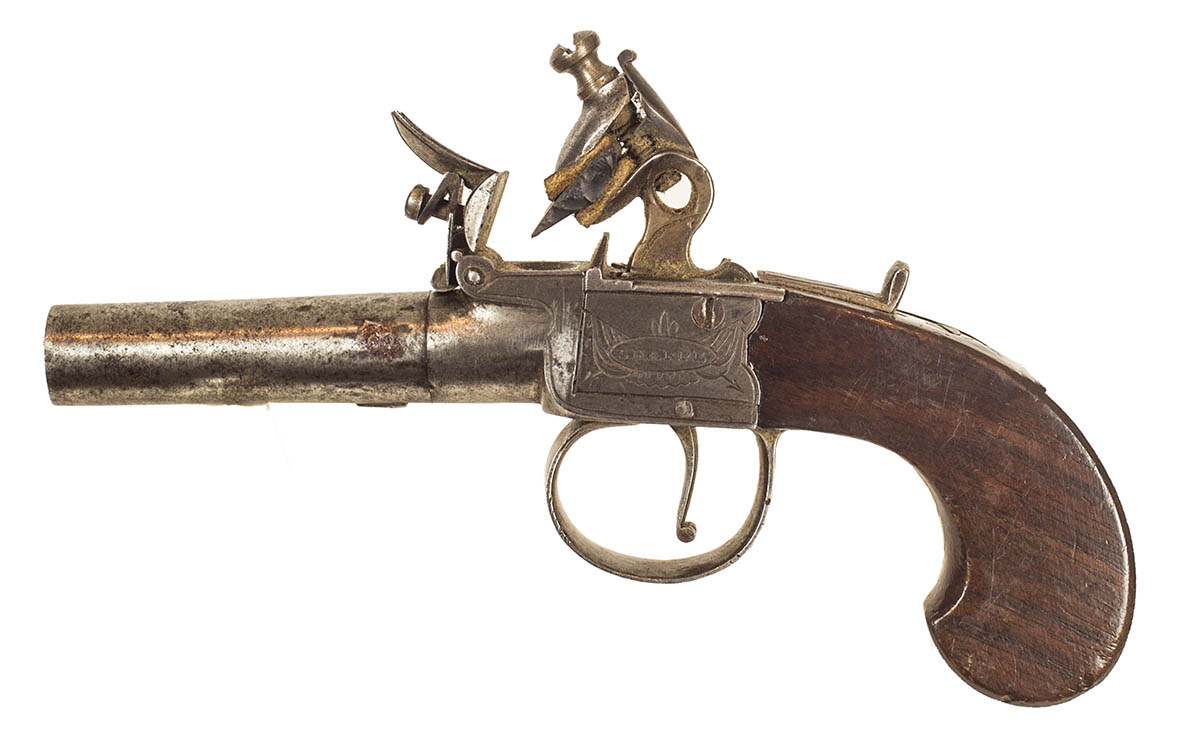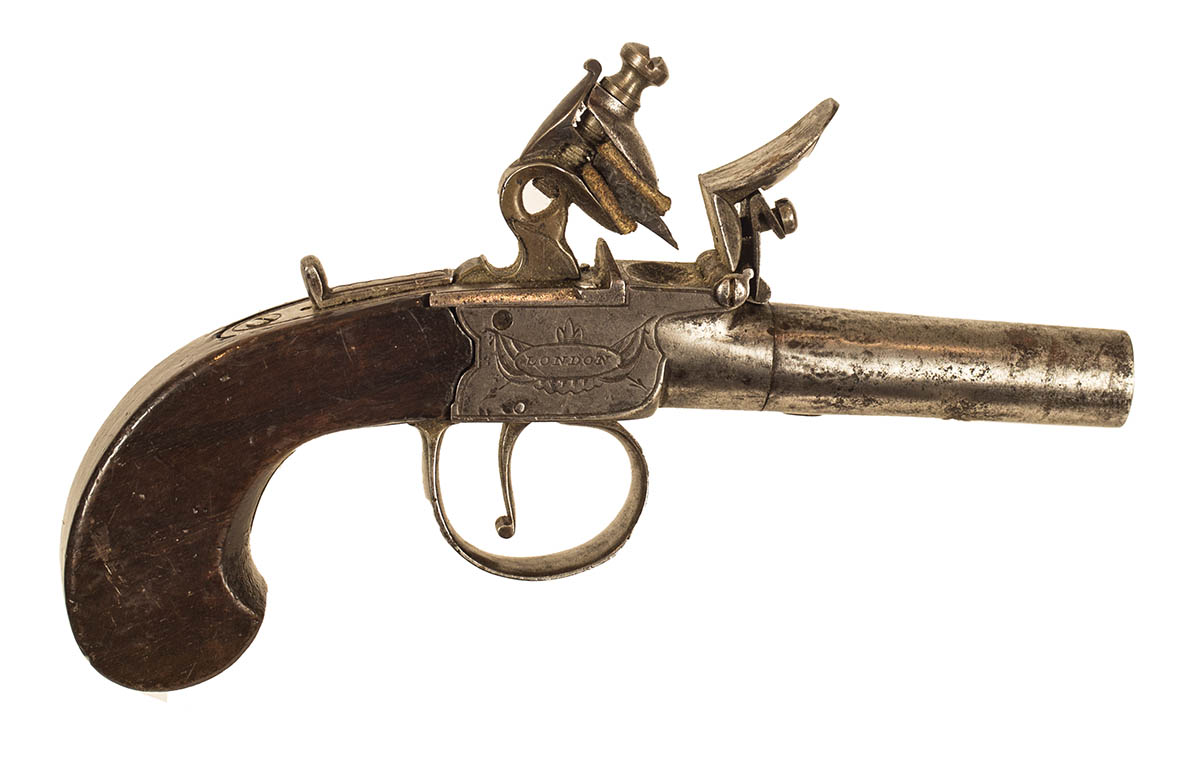 Single shot flintlock pistol, signed “Sharpe, London”, c. 1800-1820, functioning well, gray finish, 6 1/2″ l.
