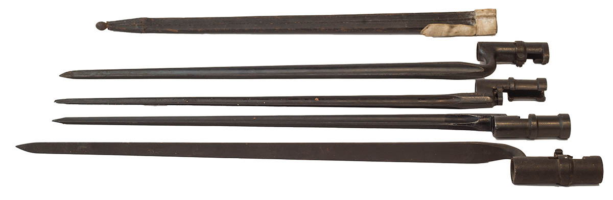 Two “US S” bayonets, one includes a sheath stamped “2482, 1884″, both 21” l; Two “Model 1891/30 Russian” bayonets, one is stamped “45258, box with X in it”, the other “8263”, both have cruciform blades and screwdriver tips.