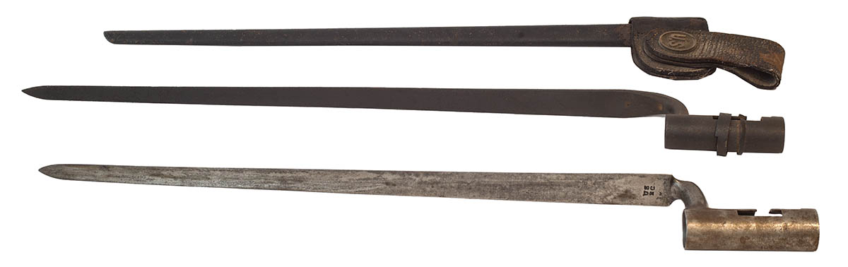 “US SC” Model 1816 musket bayonet, 19 1/4″ l; “US”, 21″ l, with “U.S.” metal and leather sheath with wear; Bayonet stamped “US” with a triangular blade, shows rust, 21″ l.