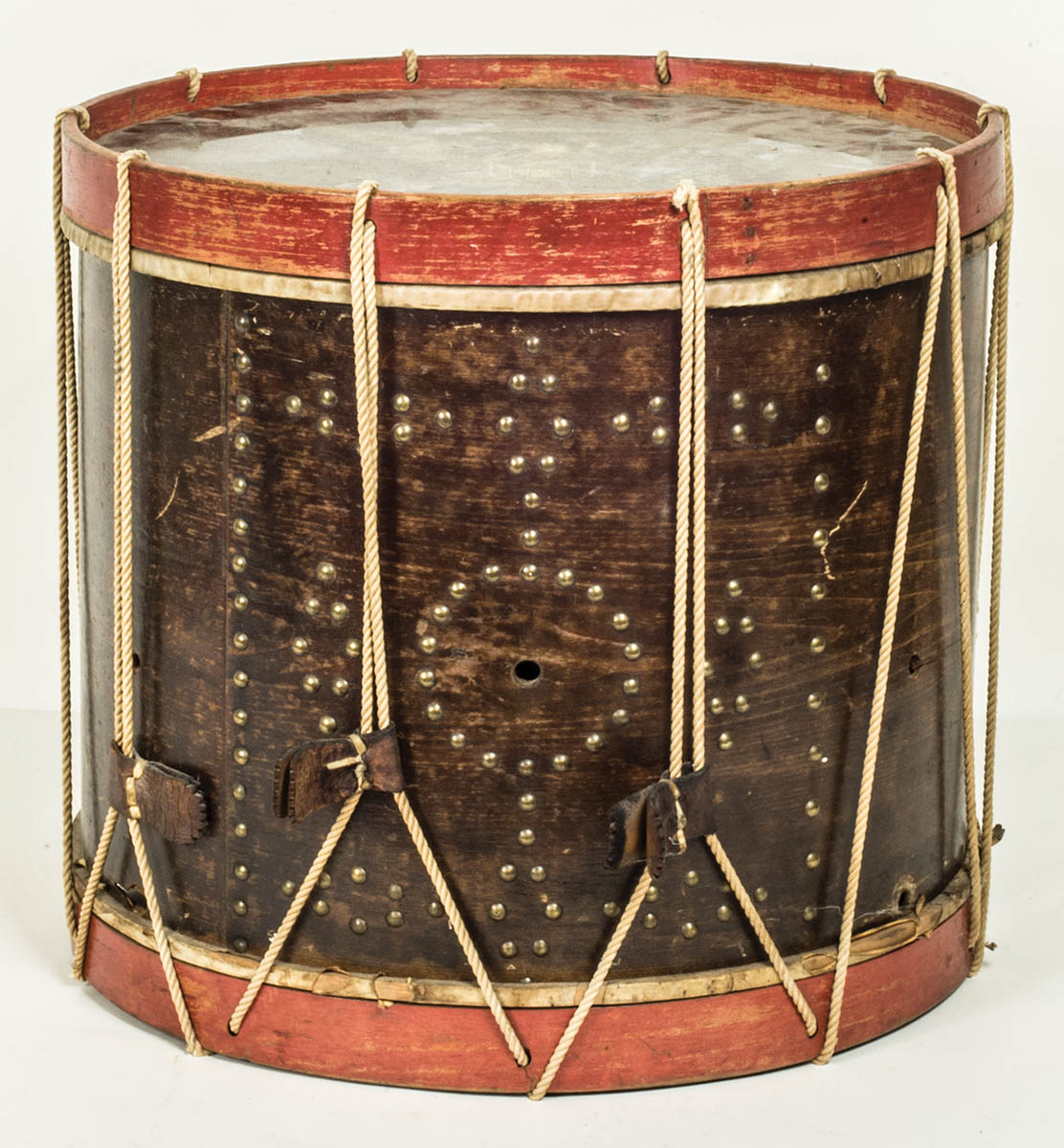 Drum with a brass tack decorated shell, this rope tension drum has wear and some damage, skins have been removed, and reverse printing on glass of an “eagle with shield, stars” replaces the top skin, paper label inside of the drum reads “E…Brown & Son, Drum Manufacturers,…Bloomfield, Conn 1843 No. 2299″, (note: the Brown family of Wiltonville and Bloomfield, Connecticut are reputed to have produced all the drums for Washington’s Continental Army – ending their family’s production making drums used in the Civil War), 16″ h, 17 1/2” dia.