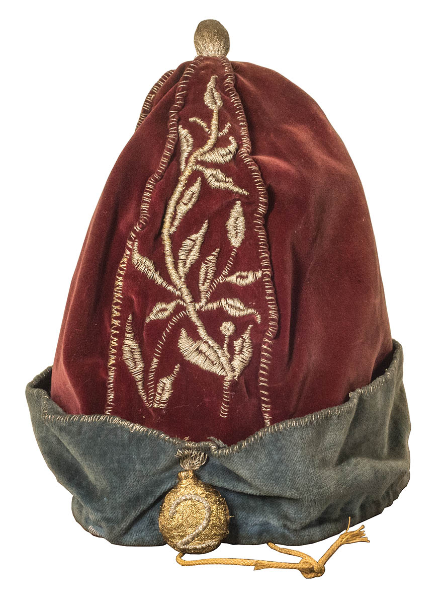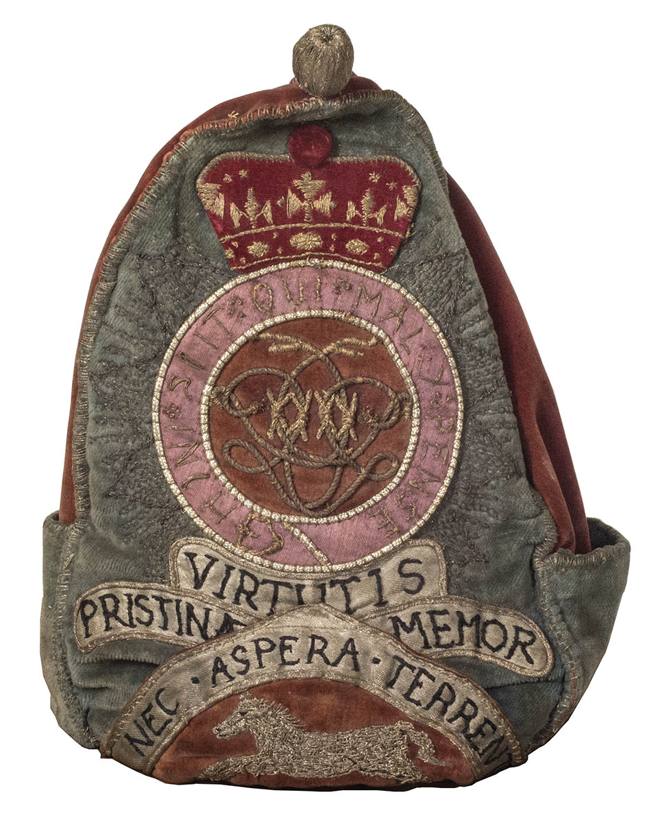 Extremely rare British Queen’s Mitre or Grenadier cap from 1759, worn by officers of the Grenadier Company of the Queen’s Royal Regiment of Surrey, related example in Surrey Infantry Museum, England, translated mottos “Mindful of Former Valor”, and “No Fear on Earth”.