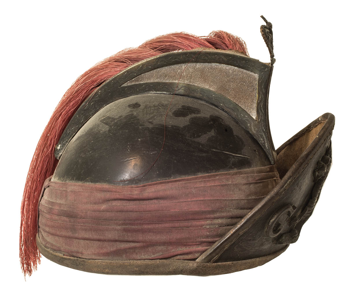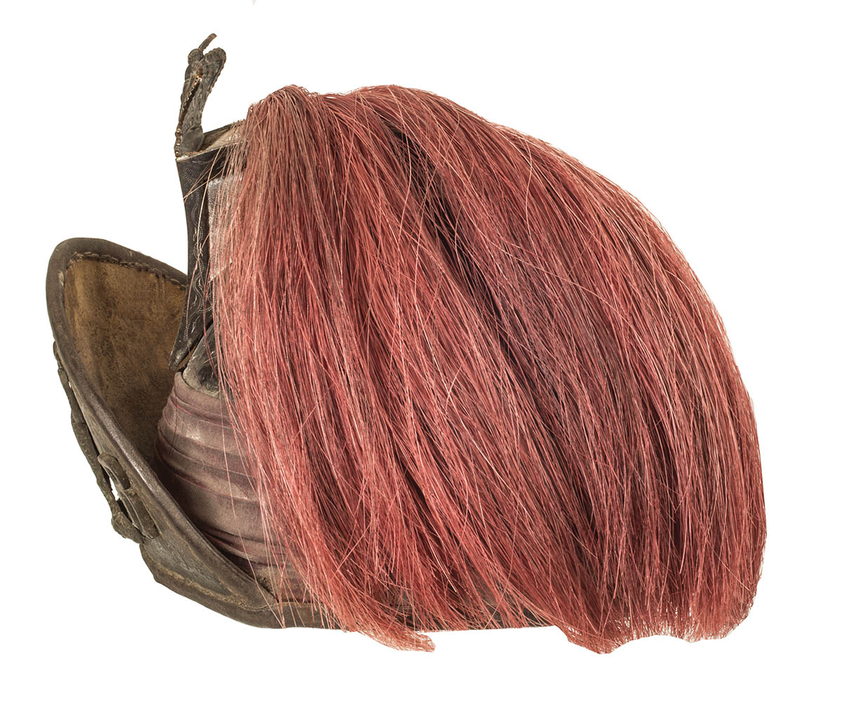 Revolutionary War era, attributed to the Royal East Kent Regiment, 3rd Regiment of Foot (Infantry) who were in September 1781 engaged in the Battle of Eutaw Springs in S.C. against General Greene and “Light Horse” Lee, the leather helmet has brass “G, dragon, R” on front piece, and a “crown and III” on the brass edging of the top horsehair plumed ridge.