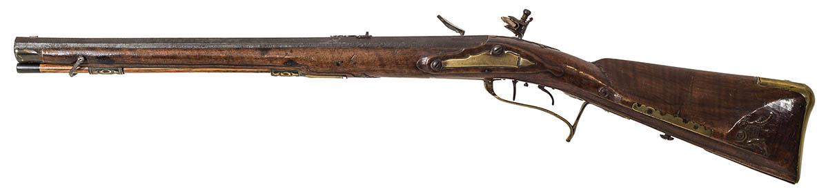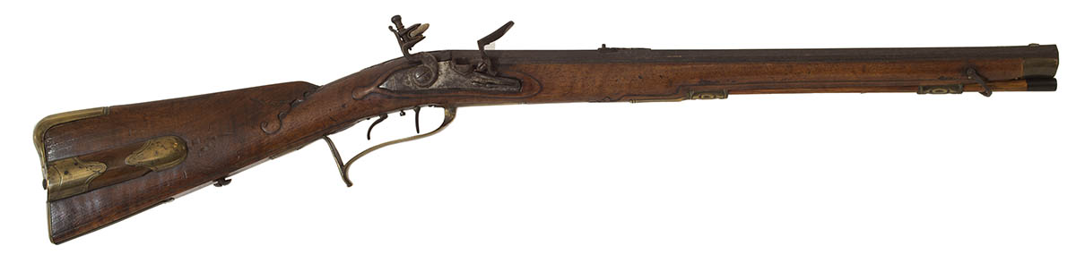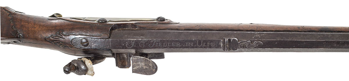 German origin, two triggers, wooden covered patch box, signed on top of barrel “J.G. Fiedler in Ulm”, (short rifle illustrated on p. 226 of George C. Neumann’s book Battle Weapons of the American Revolution, Neumann states that 4,000 short rifles were used by Hessian (German) troops in the war), 34 1/2″ l.