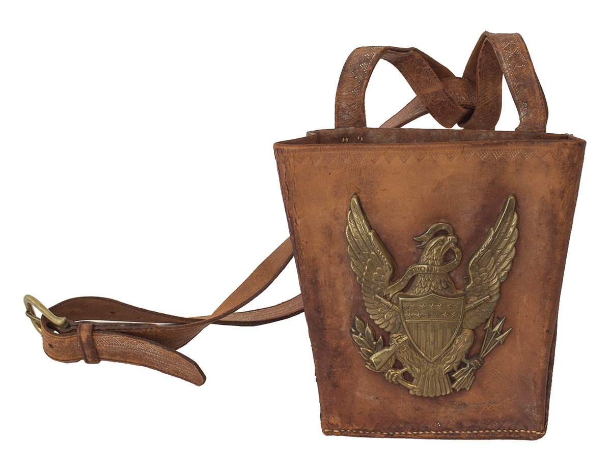 Leather pouch and belt, exhibiting a finely detailed brass “eagle with shield”, minor wear, age not determined, 6 3/4″ x 6″.