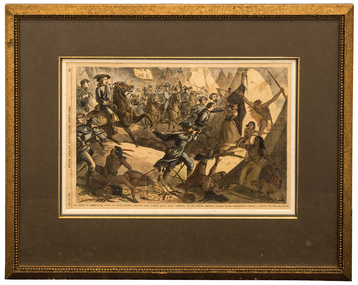 Hand colored 19th c. newspaper print, Dec. 26, 1868, “Battle of Washita – the Attack on Black Kettle’s Cheyenne Camp Washita River, Indian Territory by the Seventh Regiment Cavalry under Major-General George A. Custer Nov 27th”, framed and matted, 9 3/4″ x 14 3/4″ (print), 18″ x 22 3/4″ (frame).