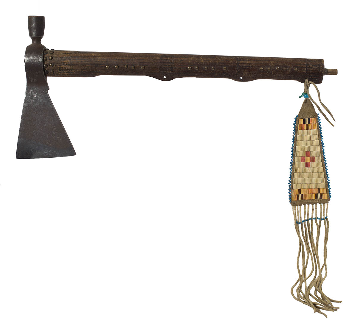 Early pipe tomahawk, with teardrop shaped eye, the haft has worn file branded decoration with brass tacks and a beaded edge, quill decorated drop, 20″ l.
