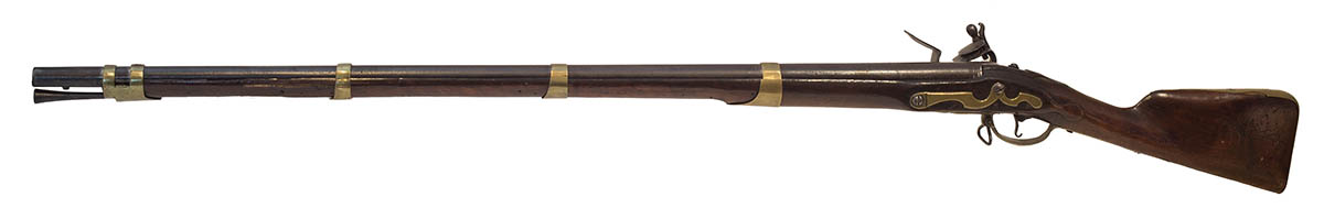 “No 463” on top of barrel, Dutch musket used by Americans in Revolutionary War, illustrated in George C. Neumann’s book Battle Weapons of the American Revolution, #61 on p. 111, autograph signature of George C. Neumann on card on musket, 56″ l.