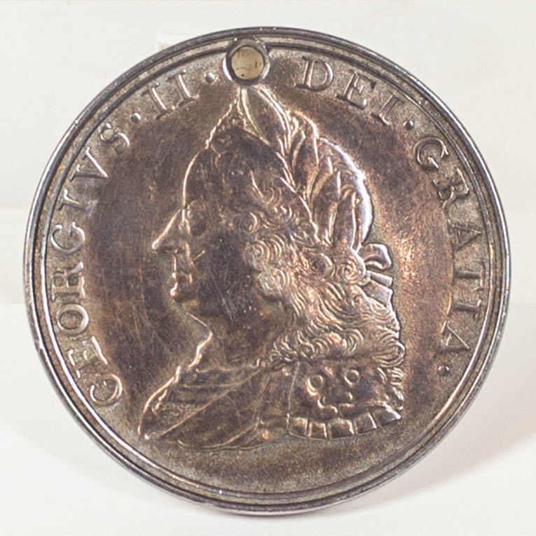 Exhibits King George II on the front, and a Native American and a colonist around a campfire passing a branch on the back, “Georgivs II Dei Gratia” is in raised letters on the front, and “Let Us Look to the Most High, Who Blessed our Fathers with Peace, 1757″, 1 3/4” dia, (Lit. National Museums of Canada, Indian Ceremonial and Trade Silver, Ottawa, 1980, p. 77-3, illustrated), from 1757 to 1950 four restrikes of this medal are recorded, age undetermined, with minor wear.