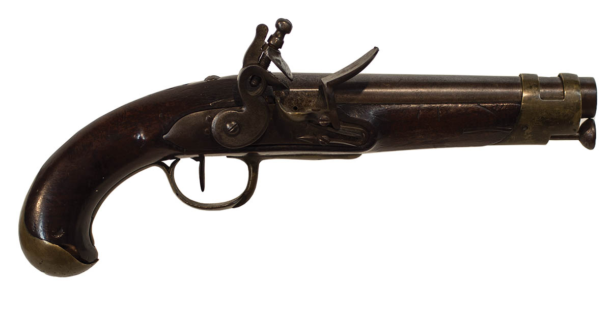 Brass trigger guard, butt cap, and front band, lock plate is unmarked, old stock chips, c. 1810-1820, 11 1/2″ l.