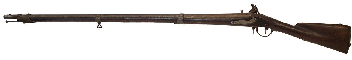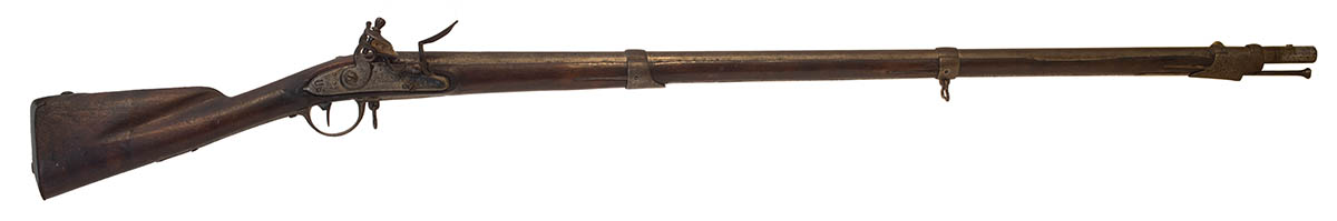 French origin, marked “Charleville” on lock plate, “US” engraved on back of lock plate, used in the Revolutionary War, original iron ramrod, U.S. surcharged, some very old damage to stock, in-use wear, 60″ l.