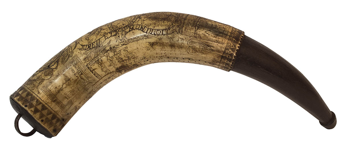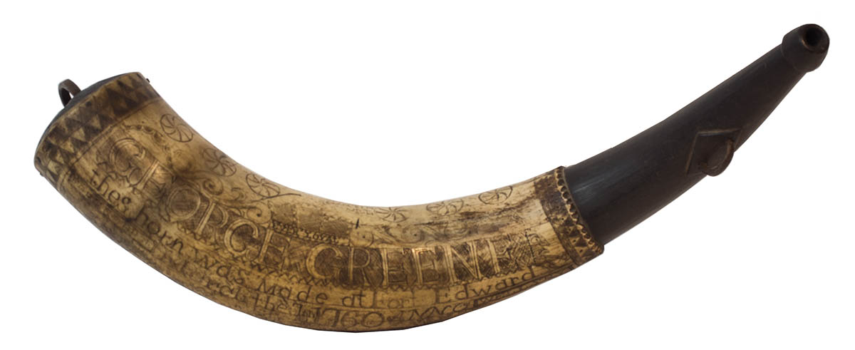 Scrimshawed, “George Greene, This horn was made at Fort Edward March the 7th 1760, Anno, SV”, (French and Indian War era), with a ship, and four soldiers in tricorn hats firing rifles, New York, 15 1/2″ l.