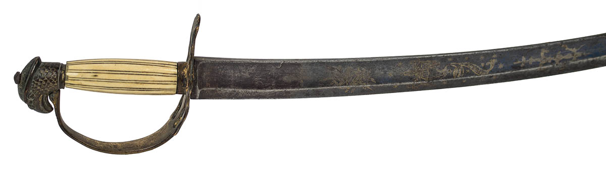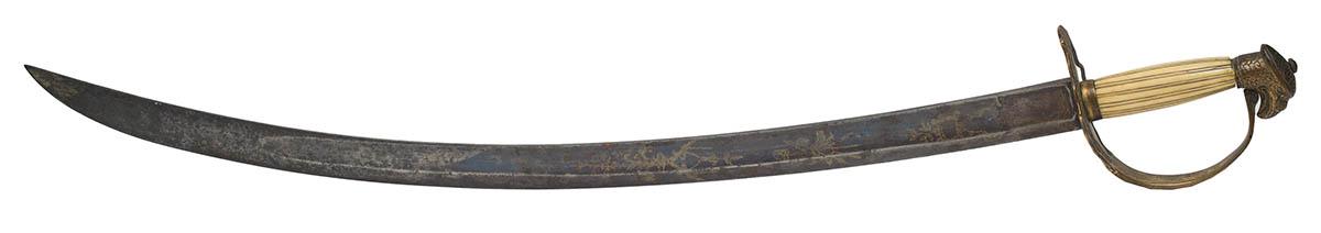 Carved bone grip with eagle head pommel, brass hand guard terminating with scallop shell, blade engraved with “E. Pluribus Unum”, eagle and shield, oval with “Richards Upson & Co”, “New York”, gilded, liberty pole and hat on opposite side, 33″ l.