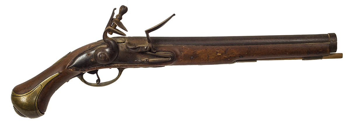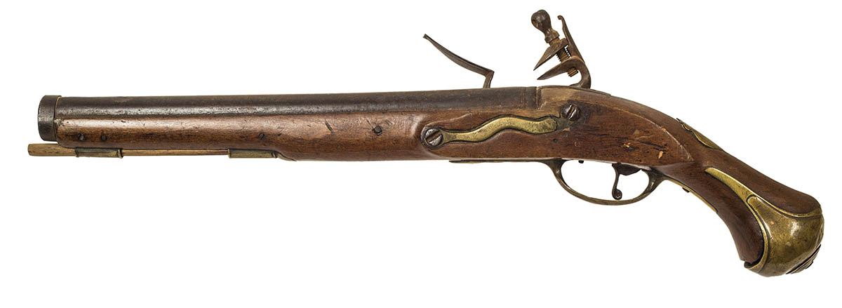 Pistol with wear, cherry wood stock, brass mounted, early lock, unmarked 12 1/2″ barrel, band around muzzle, 20 1/2″ l.
