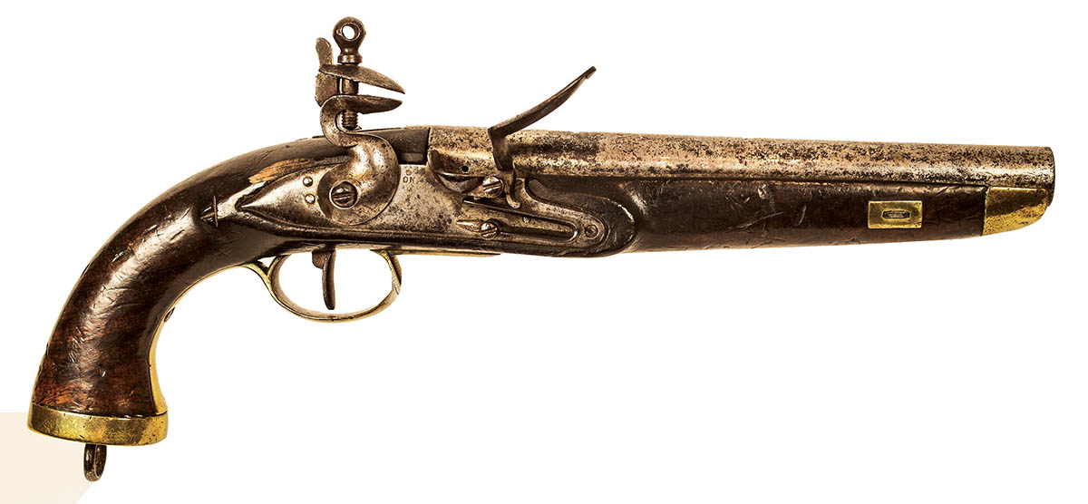 Francis Bannerman flint gun, pistol stamped “Crown, O, N” on lock plate, with wear, good shape, 16″ l.