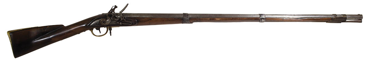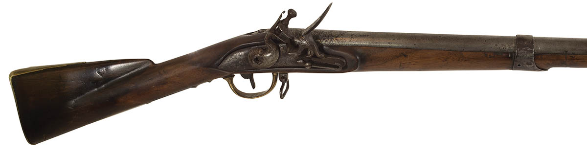 Musket with wear, repairs, and a missing hammer screw, unmarked, German pan, worked on shortened barrel by 1/2″ (43″ l), 58 1/2″ l.