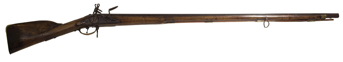 “Dutch Liege” musket used by colonial troops in the French and Indian War, and Revolutionary War, exact gun pictured in George C. Neumann’s book, Battle Weapons of the American Revolution, p. 110, purchased in England in 1741, 46″ barrel, 61 1/4″ l.