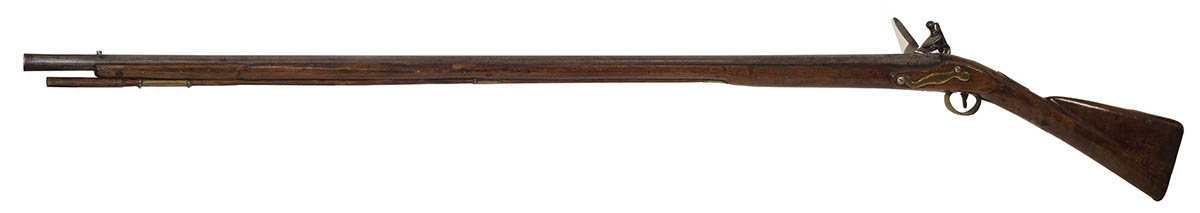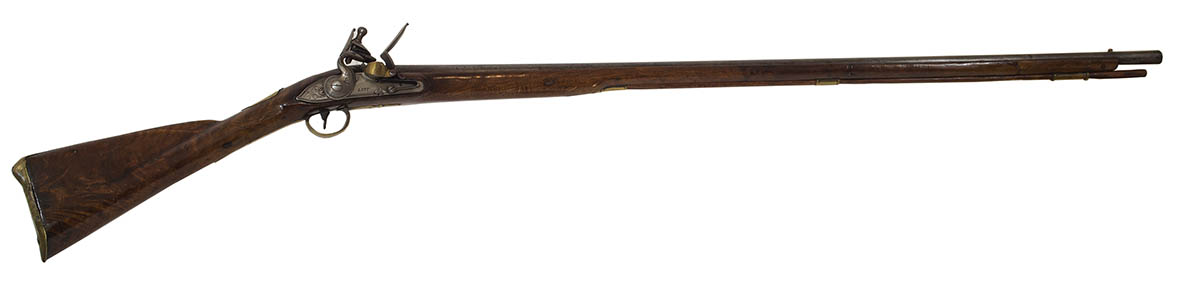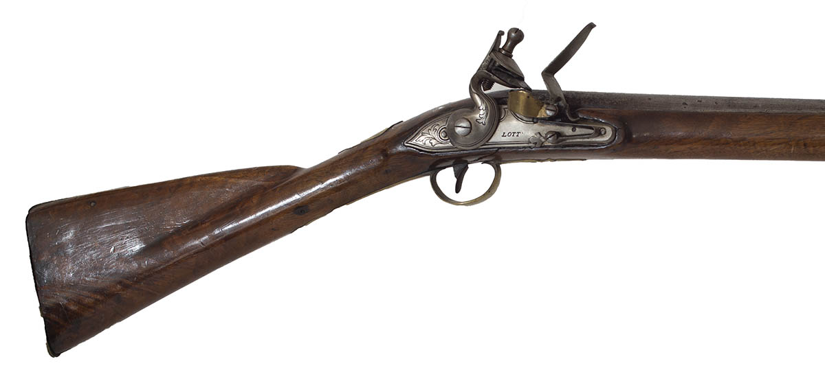 “Lott, London”, reproduction lock, stock crack and probable repair, probably used in reenactment, barrel, stock and trigger guard appear to be original, original ramrod, 44 1/2″ barrel, 59 1/2″ l.
