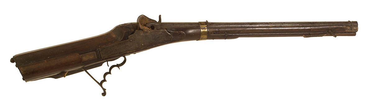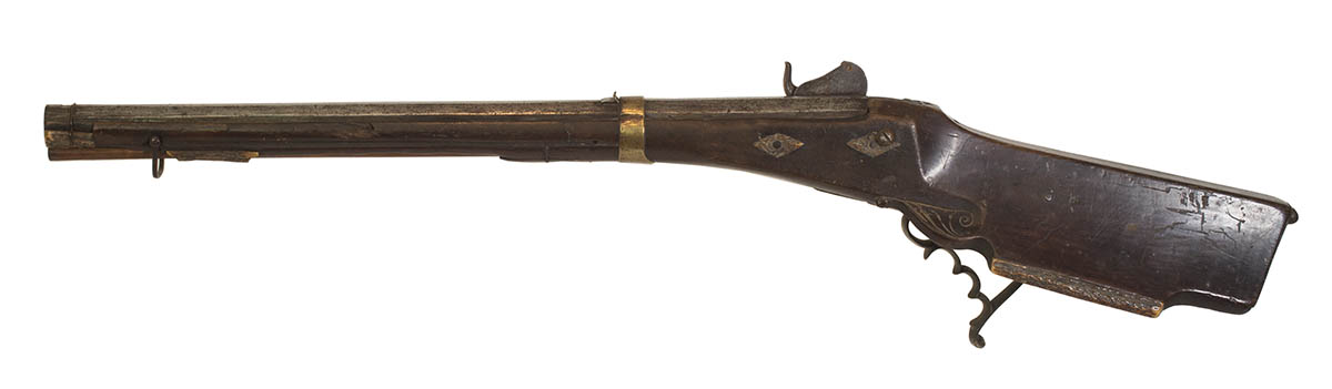 Engraved “1664” on top of tapered octagonal barrel, with stag horn and carved stock detail, rifled barrel, 33″ l.
