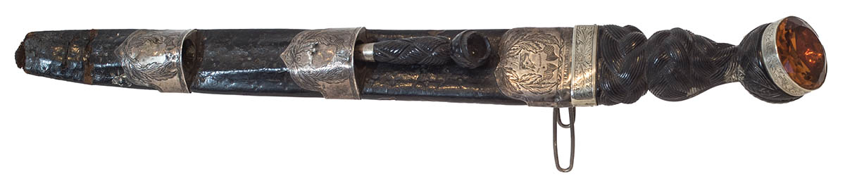 “Peter Henderson Maker Glasgow”, carved wooden handles, finely engraved silver detail, made for “Arch D. Campbell, Follow Me, A.C., of the Celtic Lodge”, (end of sheath damage, fork missing, jewel from small knife missing), 14 1/4″ l.
