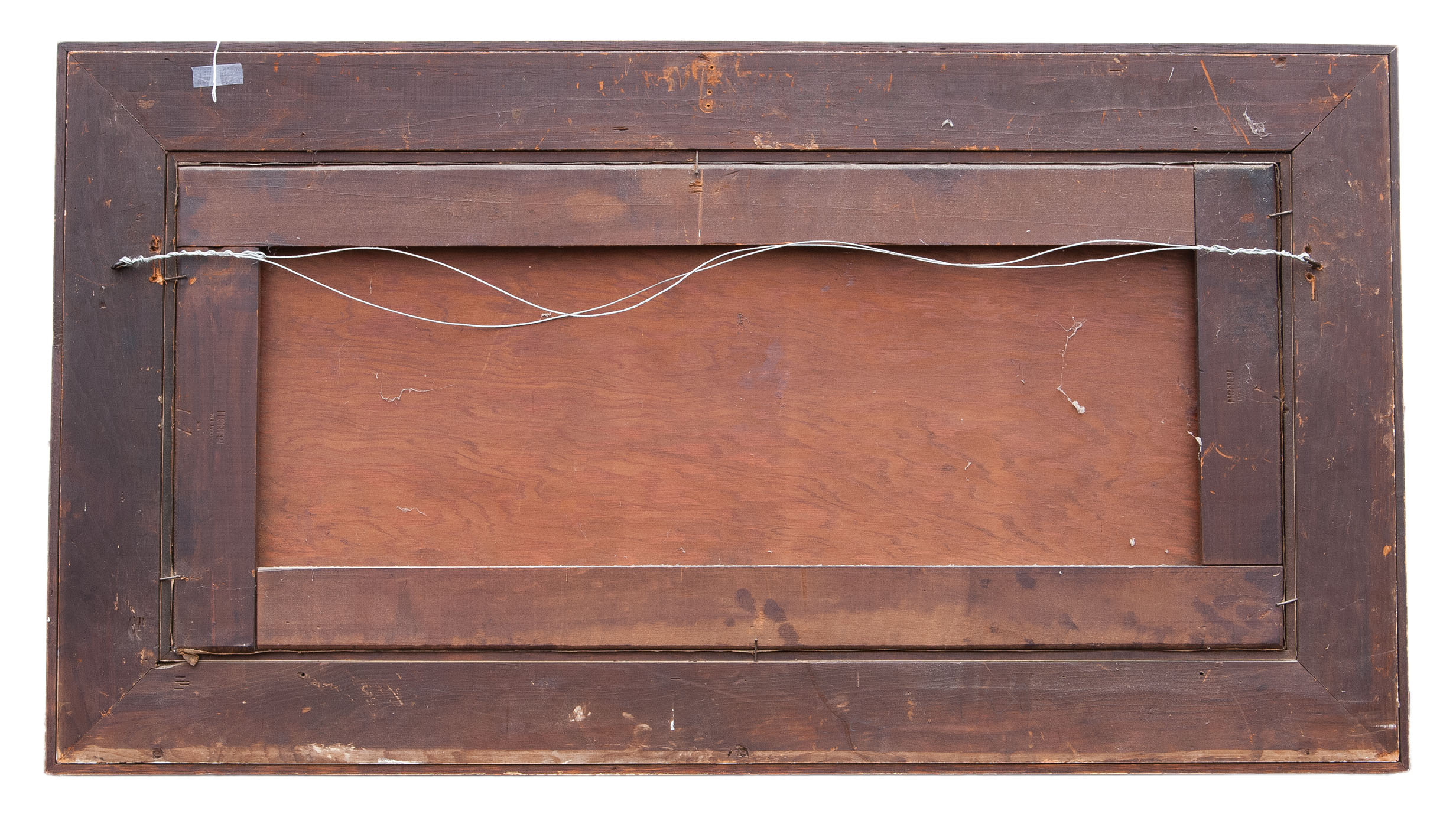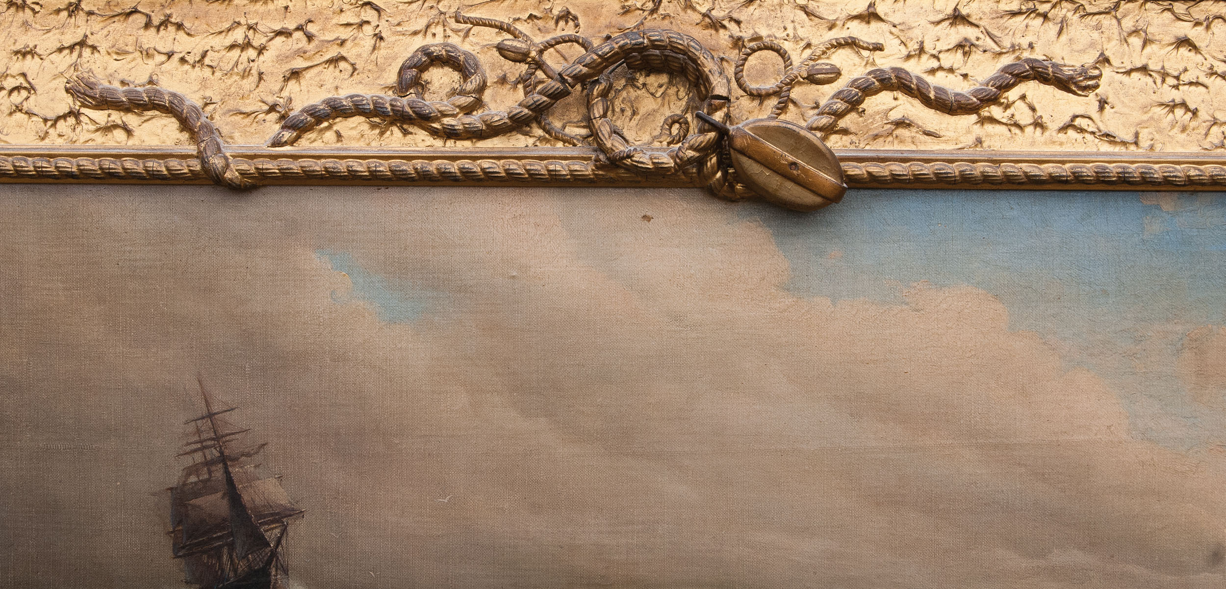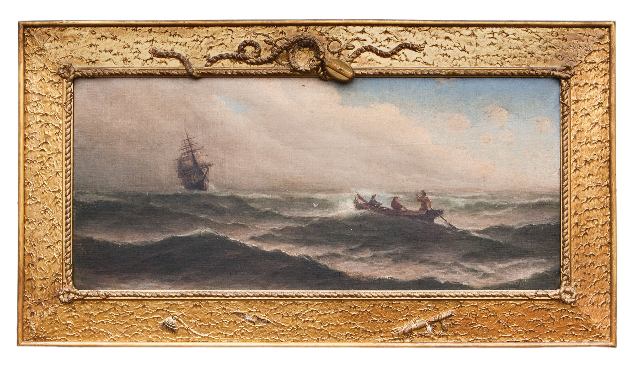 Seascape with a dory and three sailors rowing out to a three-masted ship on a turbulent sea, in an intricately carved gilt frame depicting ropework and a pulley at top, and a buoy and part of a mast at the bottom, the entire frame with plaster shaped into waves and ocean swell, signed “E.G. Franklin” and illegible date, originally owned by W. Torrey Little, famed Marshfield, MA auctioneer, 17 1/2″ x 39″ (sight).