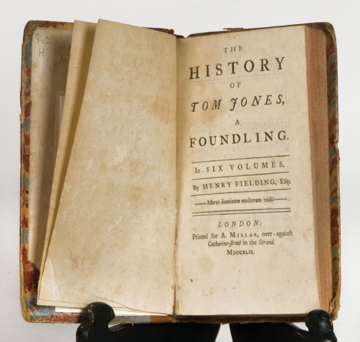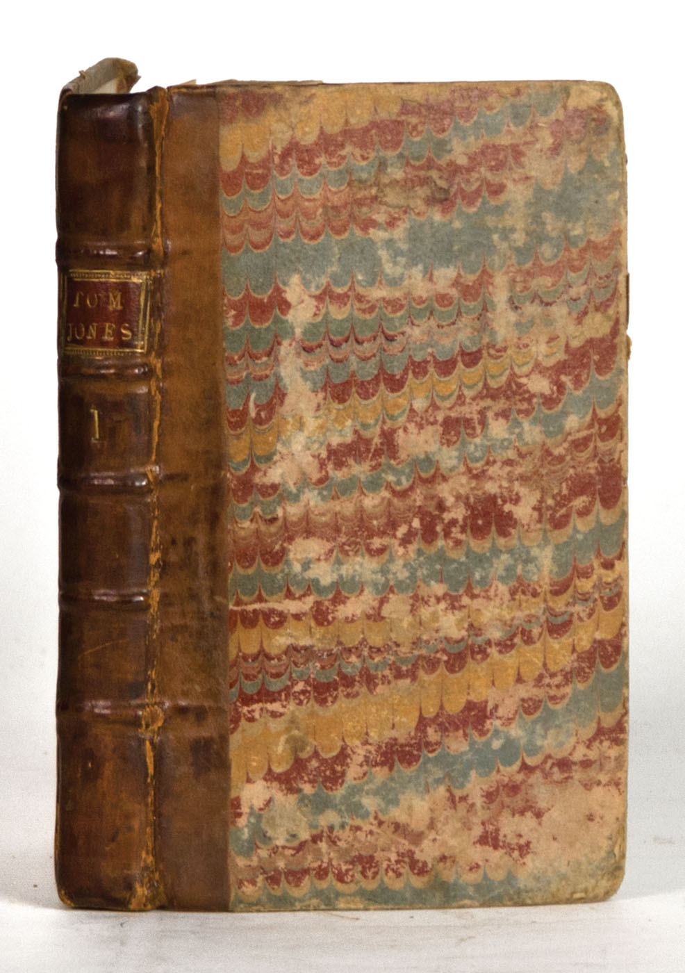 “The History of Tom Jones, A Foundling”, (8vo) in six vols. by Henry Fielding, 1749. First edition, printed in London for A. Millar, over-against Catharine-Street in the Strand. Marbled boards show signs of rubbing and edgewear, calf spine covers features evidence of some cracking to hinges. Ex-libris plate on verso of front boards, front endpapers becoming loose near bottom gutter, interior binding is mostly tight with nicely toned pages. Overall Good to Very Good condition. From the Roche family of Norwell, MA.