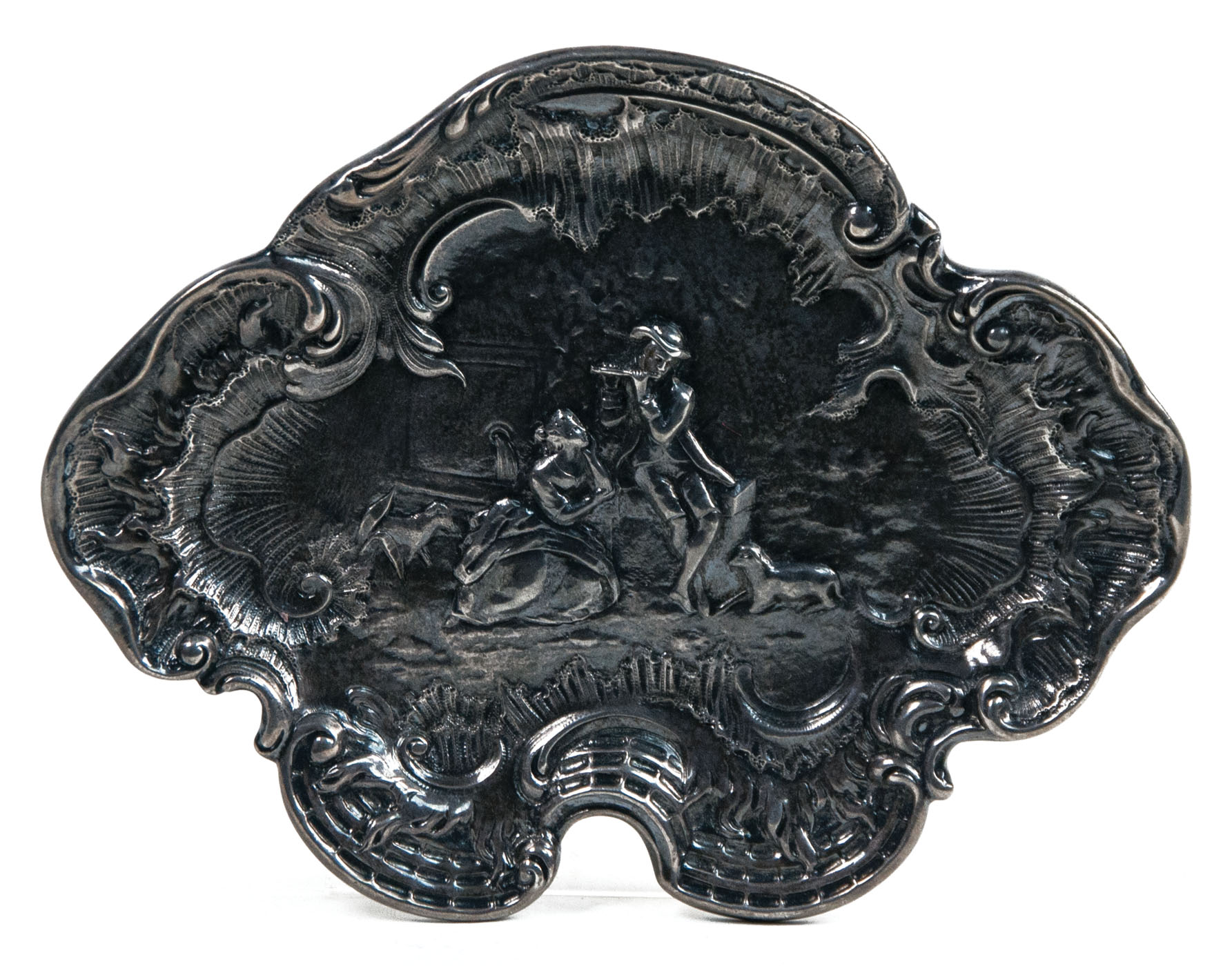 Depicting a young gentleman suitor playing a flute with an attentive young lady, marked “Tiffany & Co., 1005T 1839 sterling”, 4.75 ozt, 5″ x 6 1/2″, (ex. Dr. Oscar and Lois Hollander collection, Falmouth, MA).