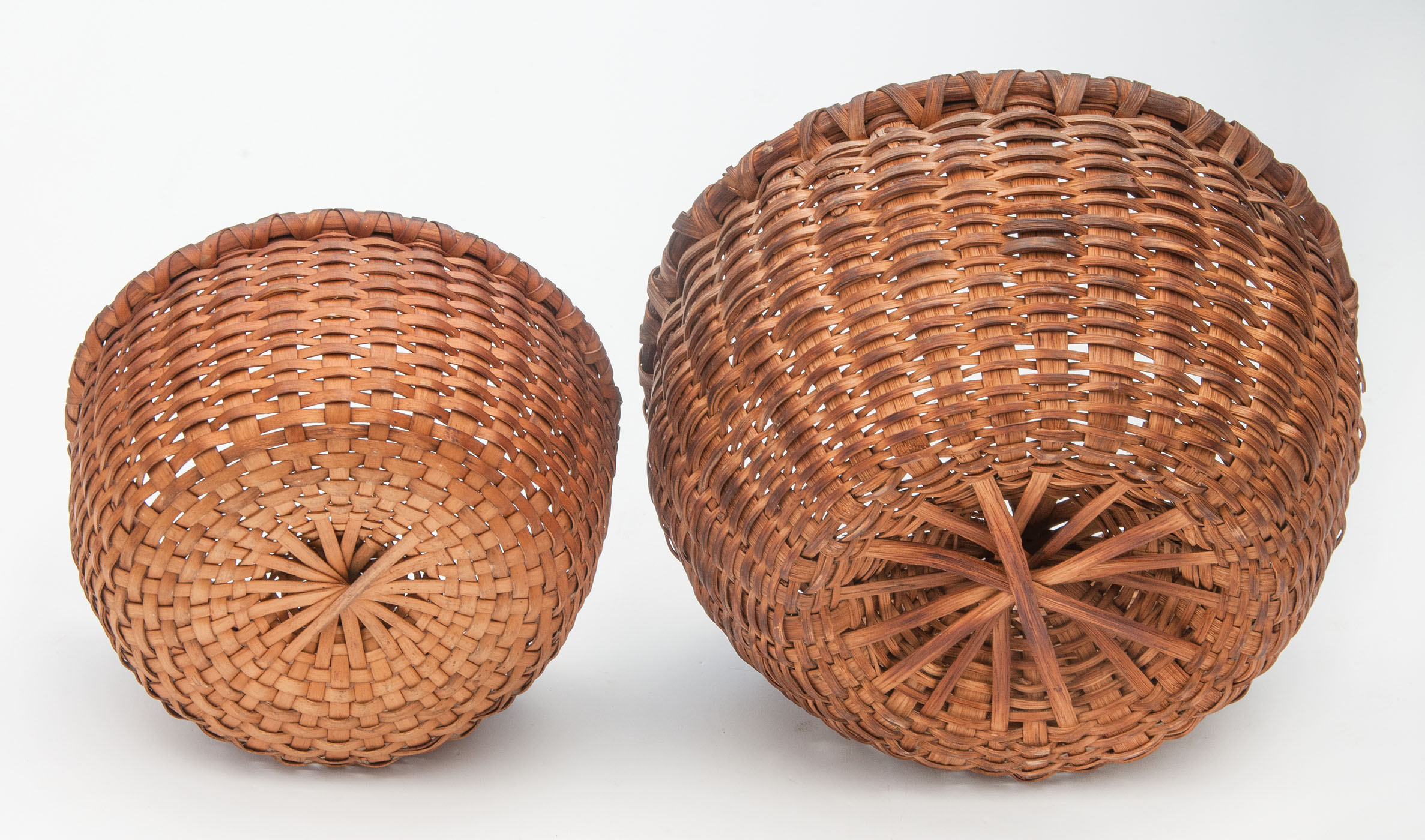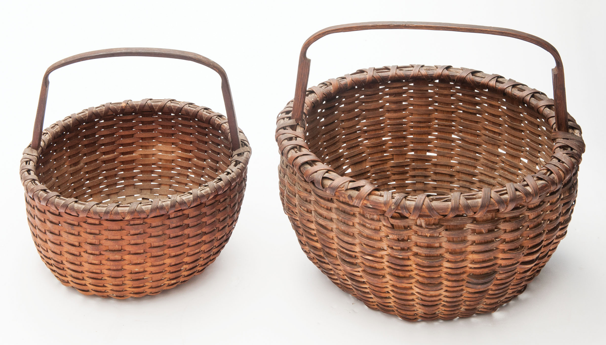 Very fine, matching graduated baskets, with wonderful carved tall handles, black ash, double wrapped rims, inverted bottoms, minor imperfections, good patina, found in Rhode Island, 4″ and 5″ h, 7 3/4″ and 10 1/4″ dia.
