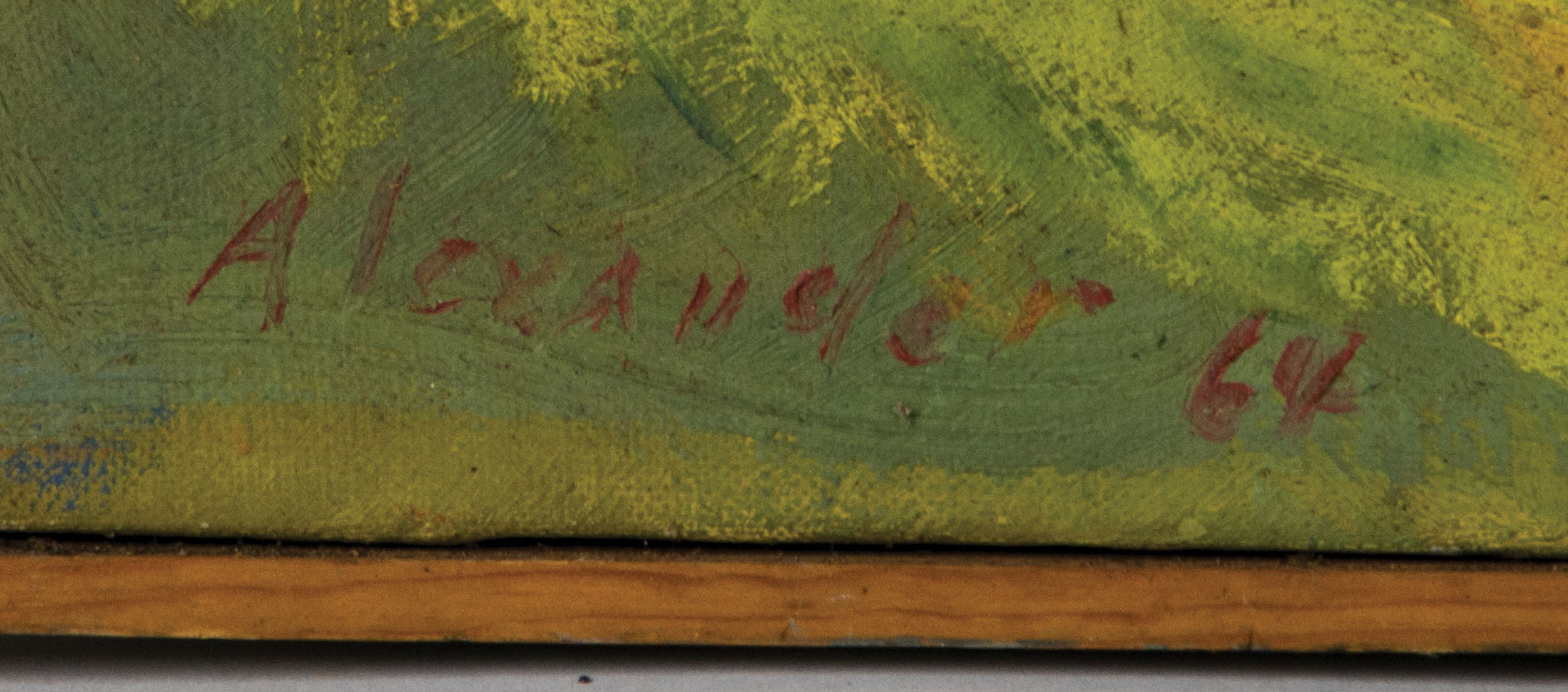 Oil on canvas of organ grinder in Central Park, signed and dated l.l. “Alexander '64″ (Alexander Geiss, New York/Russia, 1896-1974), depicts musician playing as a family watches from a bench in the background, minor craquelure in corners, minor paint loss to left edge, simple wooden frame, 28 3/4″ x 20” (sight), (ex. Tony Geiss estate, NYC).