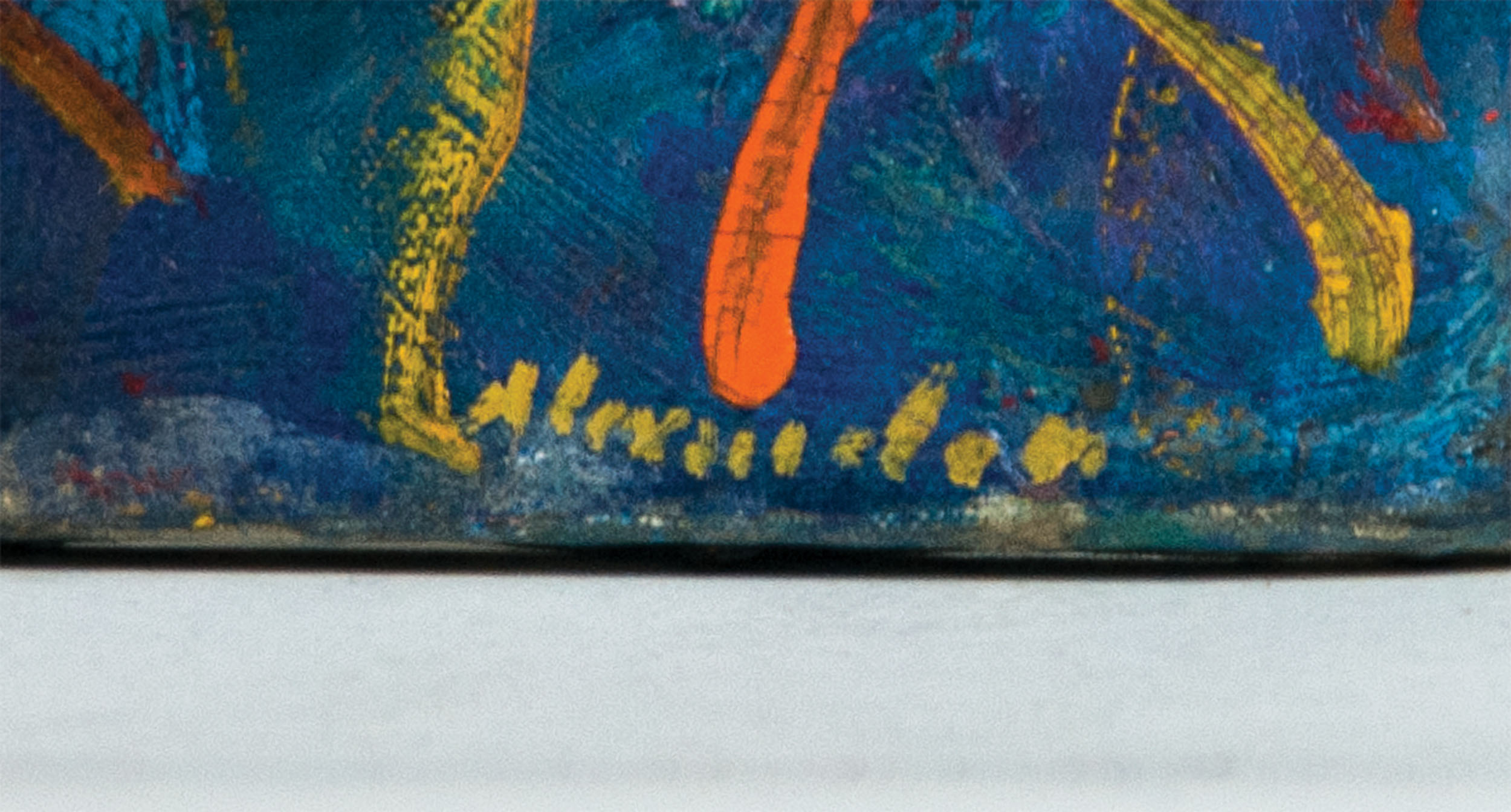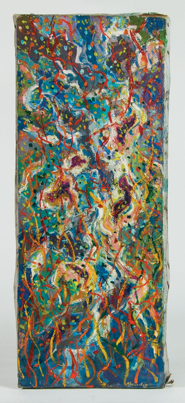 Oil on canvas, untitled work, signed l.r. “Alexander” (Alexander Geiss, New York/Russia, 1896-1974), bright colors of reds, blues, greens and purples, minor rubbing to bottom edge, unframed, 20″ x 8″ (sight), (ex. Tony Geiss estate, NYC).