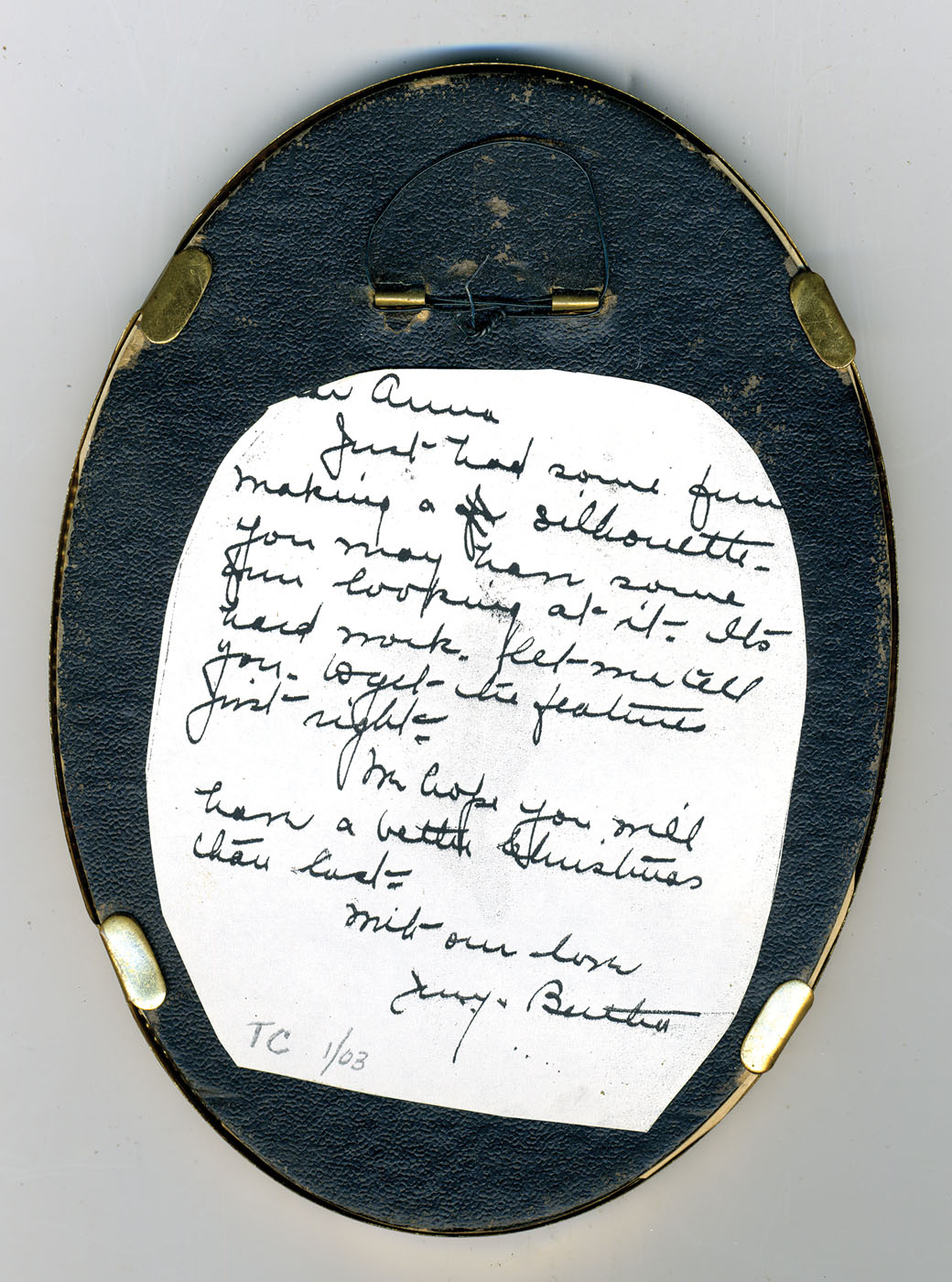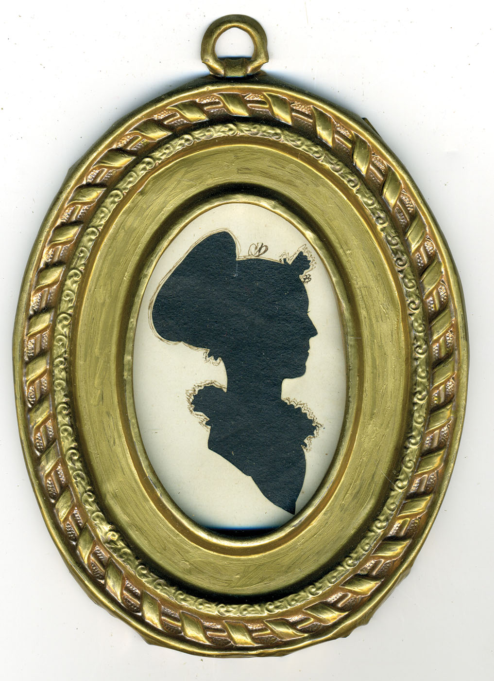 Two men and two women, in gilt oval frames, cut out with black paper and varnished black paper, the largest a woman with paper label that reads “Dear Anna, Just had some fun making a silhouette. You may have some fun looking at it. It's hard work, let me tell you, to get the features just right. We hope you will have a better Christmas than last. With our love, Jeny & Butler”, sizes range from 2 3/4″ x 2 1/4″ to 5″ x 3 3/4″ (sight), (ex. Fertig collection).