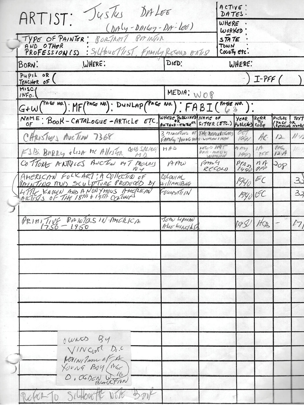 Collection of documentation, comprised of two three-ring binders full of information on miniaturist painters Justus DaLee and Abraham Parsell, as well as over 30 pamphlets and books regarding a variety of folk art including catalogs of important collections, painted furniture, coverlets, and many others, represents the lifetime research of Howard Fertig, (ex. Fertig collection).