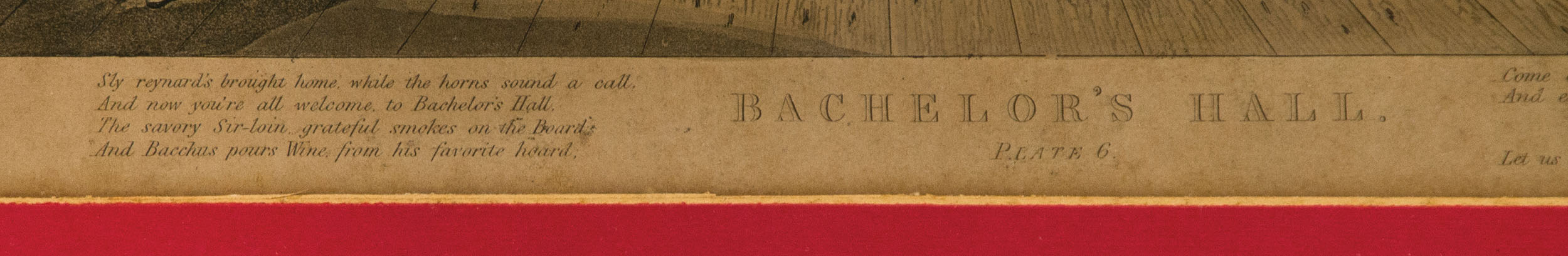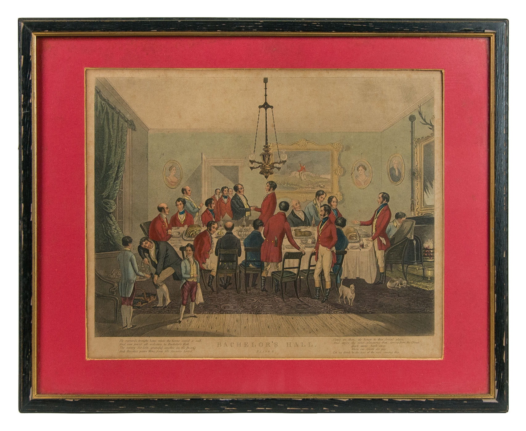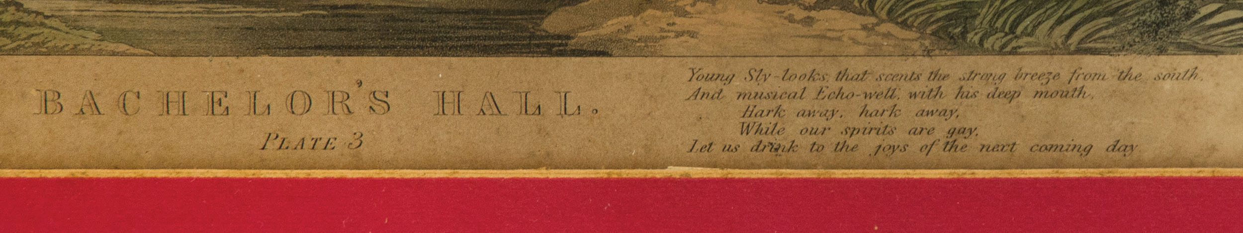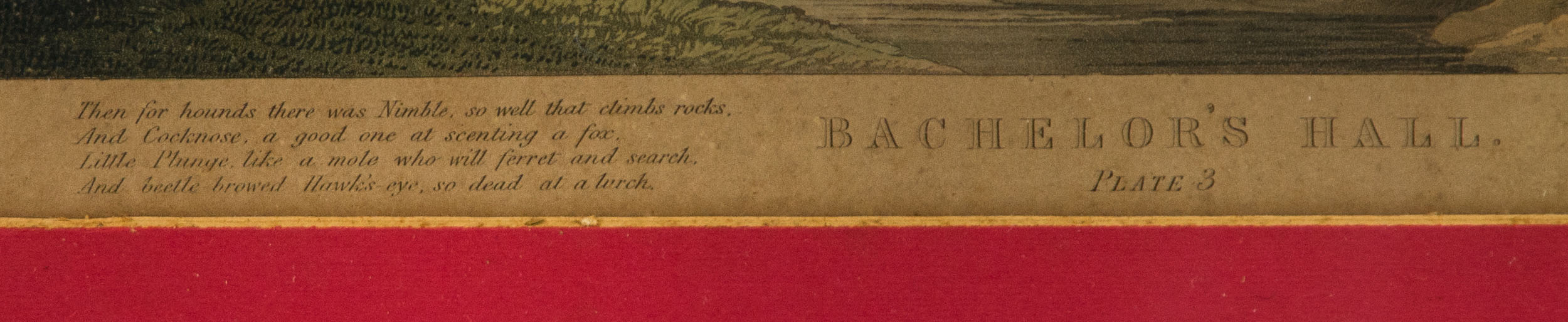 Oil on panel, signed and dated l.r. “C. Gordon 1907″, some soiling present, carved wooden and gilt frame, 7 1/4″ x 9 1/2″ (sight); and two 19th c. prints After Francis Calcroft Turner (England, 1795-1846), Bachelor’s Hall plates (3 and 6), moderate toning and foxing present, black and gilt wood frames, 11 1/2″ x 14 1/2” (sight); from the Roche family of Norwell, MA.