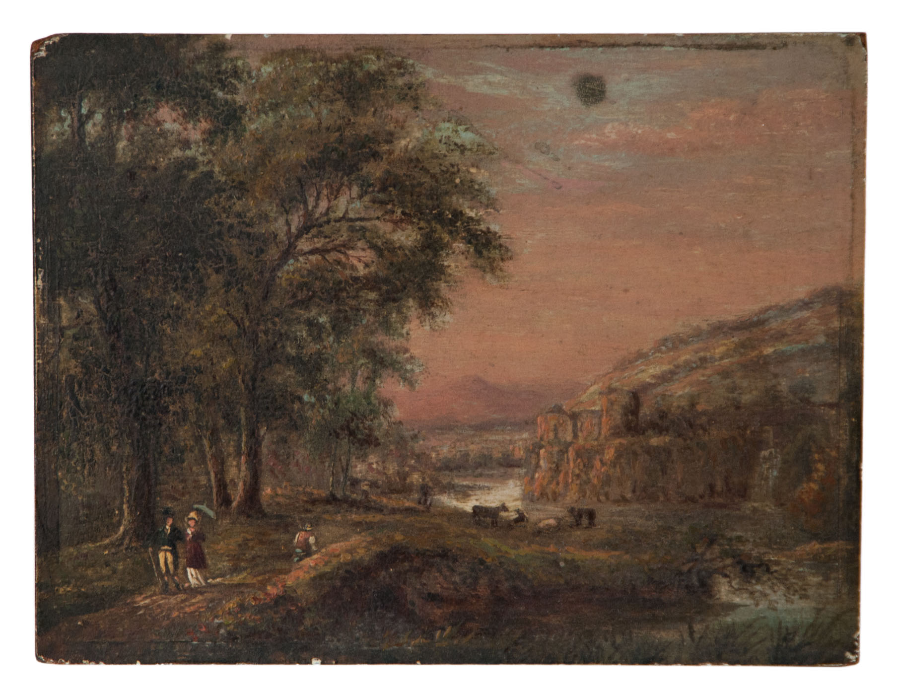 Hudson River landscape, unsigned, valley scene at sunset with people walking down a country lane, a gentleman in the distance near cows as the Hudson flows into the background, from the Roche family of Norwell, MA, 5″ x 6 1/2″.