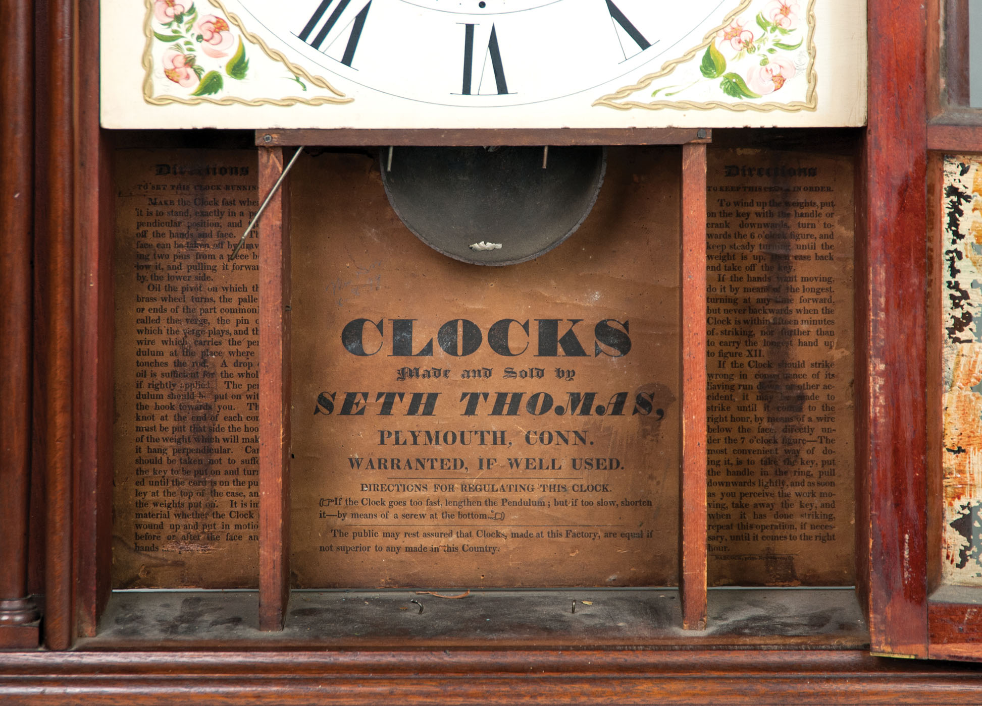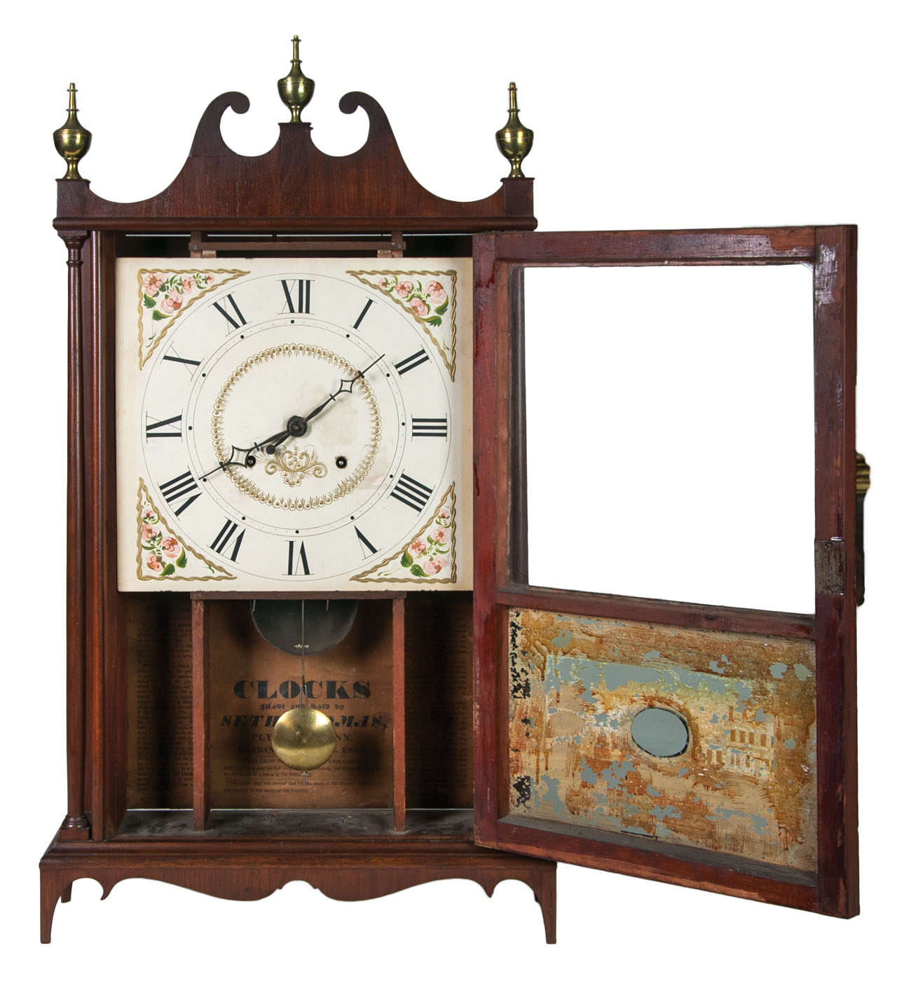 Brass urn finials, mahogany and mahogany veneered case, hand-painted face, original iron hands, interior label “Seth Thomas, Plymouth, Connecticut”, 30 hour, c. 1825/1830, reverse glass painted door, (some wear), original diamond bone escutcheon, scrolled bracket base, with brass pendulum and key, overall good condition, 31″ h, 17 1/4″ w, 4 1/2″ d.