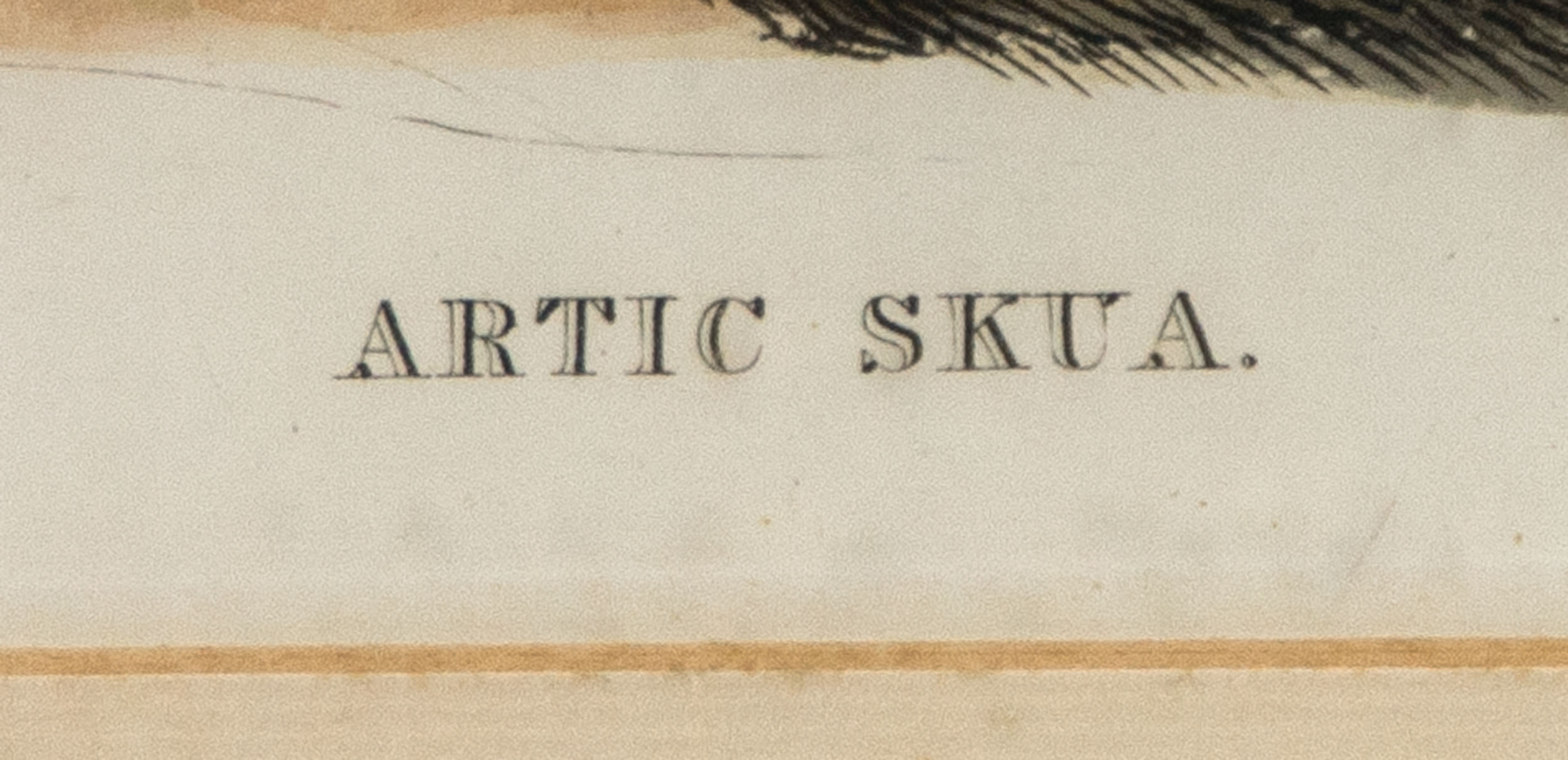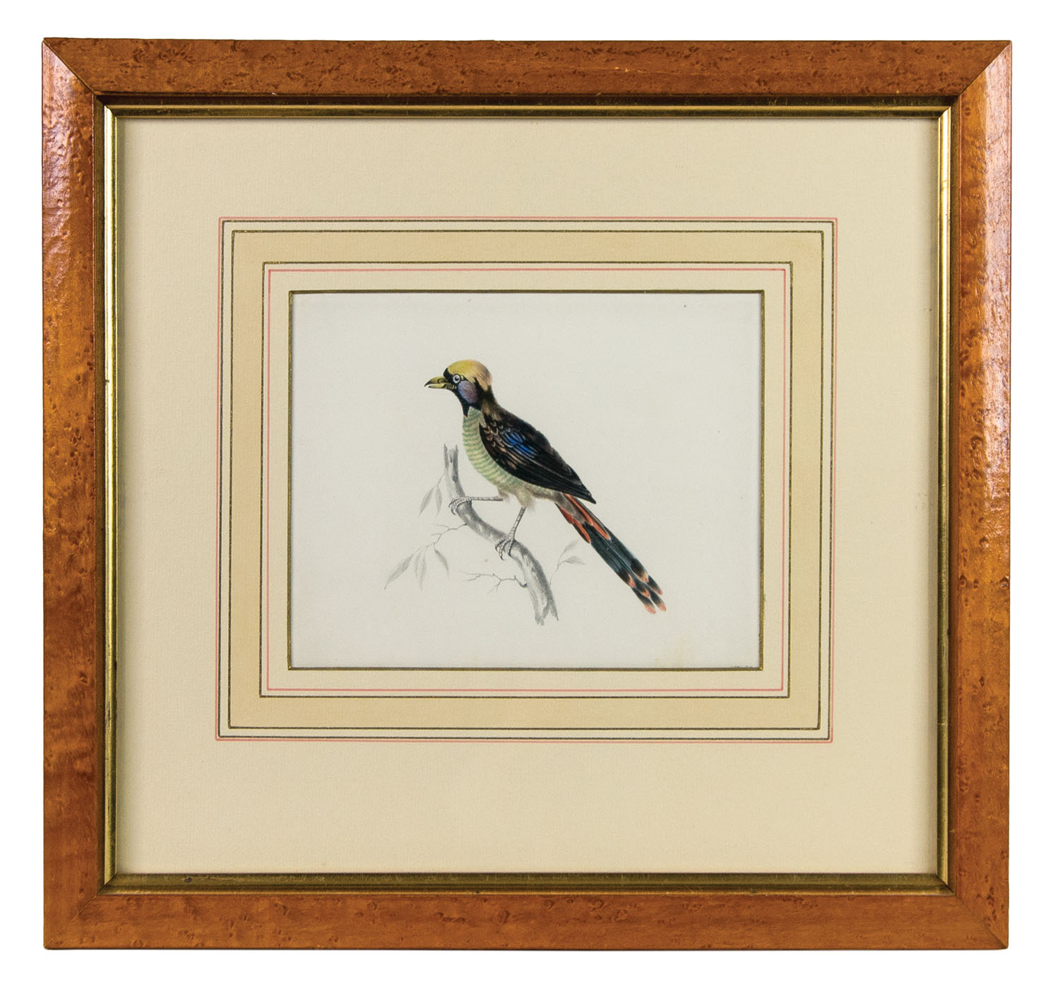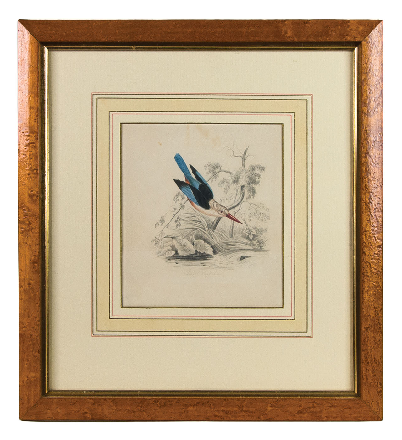 Lithograph titled “Artic Skua” after Selby (Prideaux John Selby, UK, 1788-1867), c. 1819, excellent condition, 16 1/2″ x 22″ (sight); Two pencil and watercolor studies attributed to Edwin Whitefield (Massachusetts/England, 1816-1892), titled “Senegal Kingfisher” and “Yellow Crested Song Bird”, bird's-eye maple veneer frames, 7 3/4″ x 6 3/4″ (sight); from the Roche family of Norwell, MA.