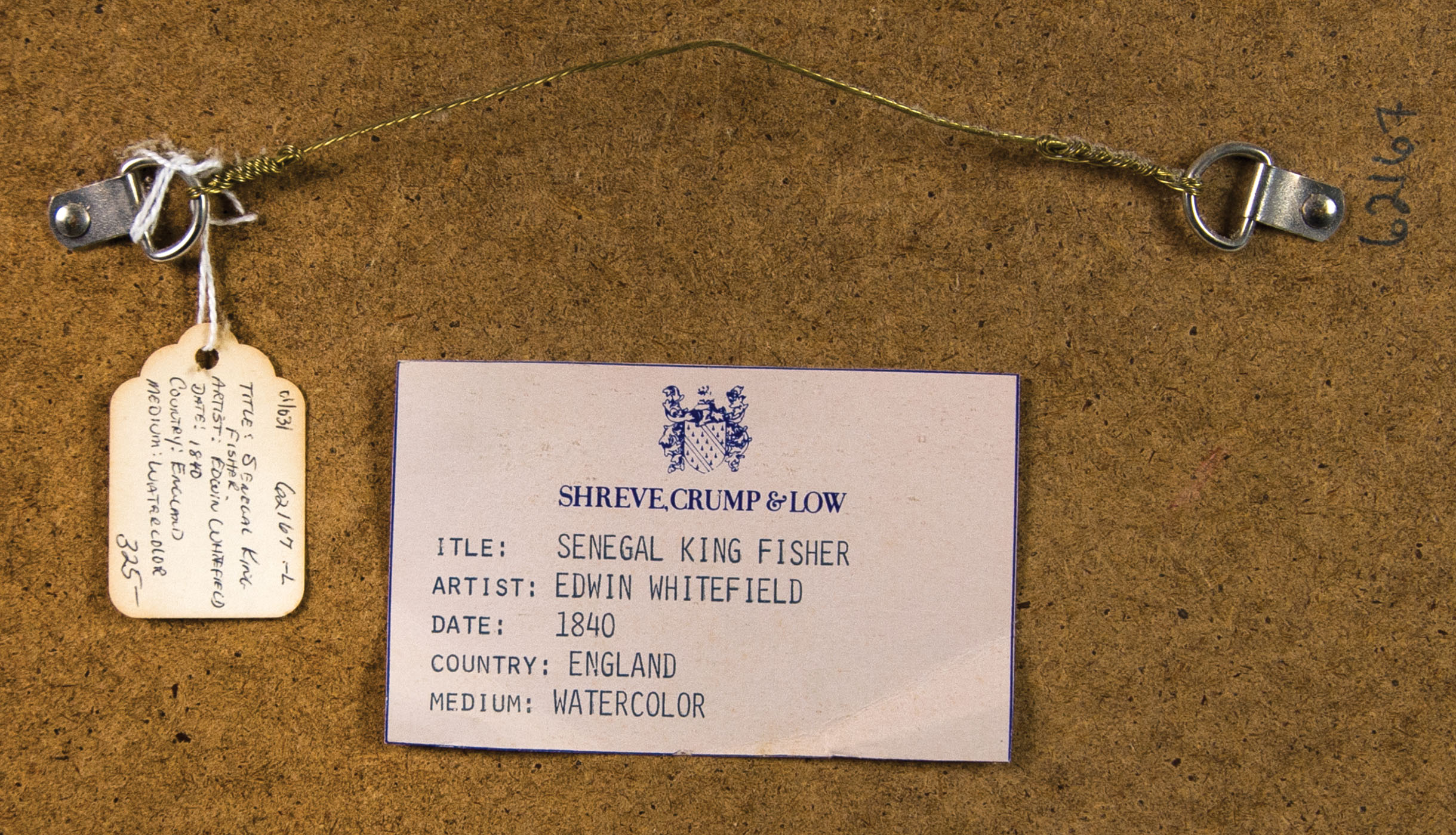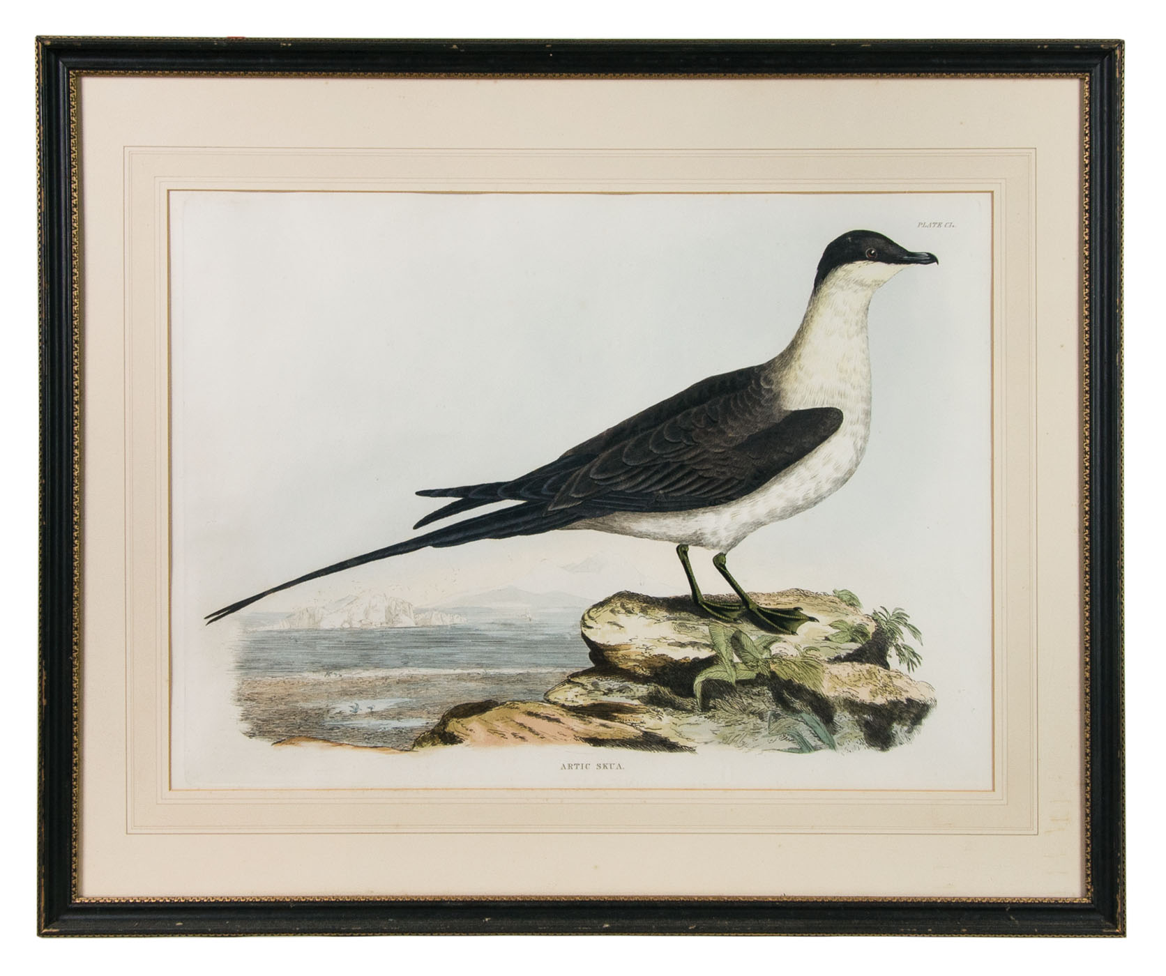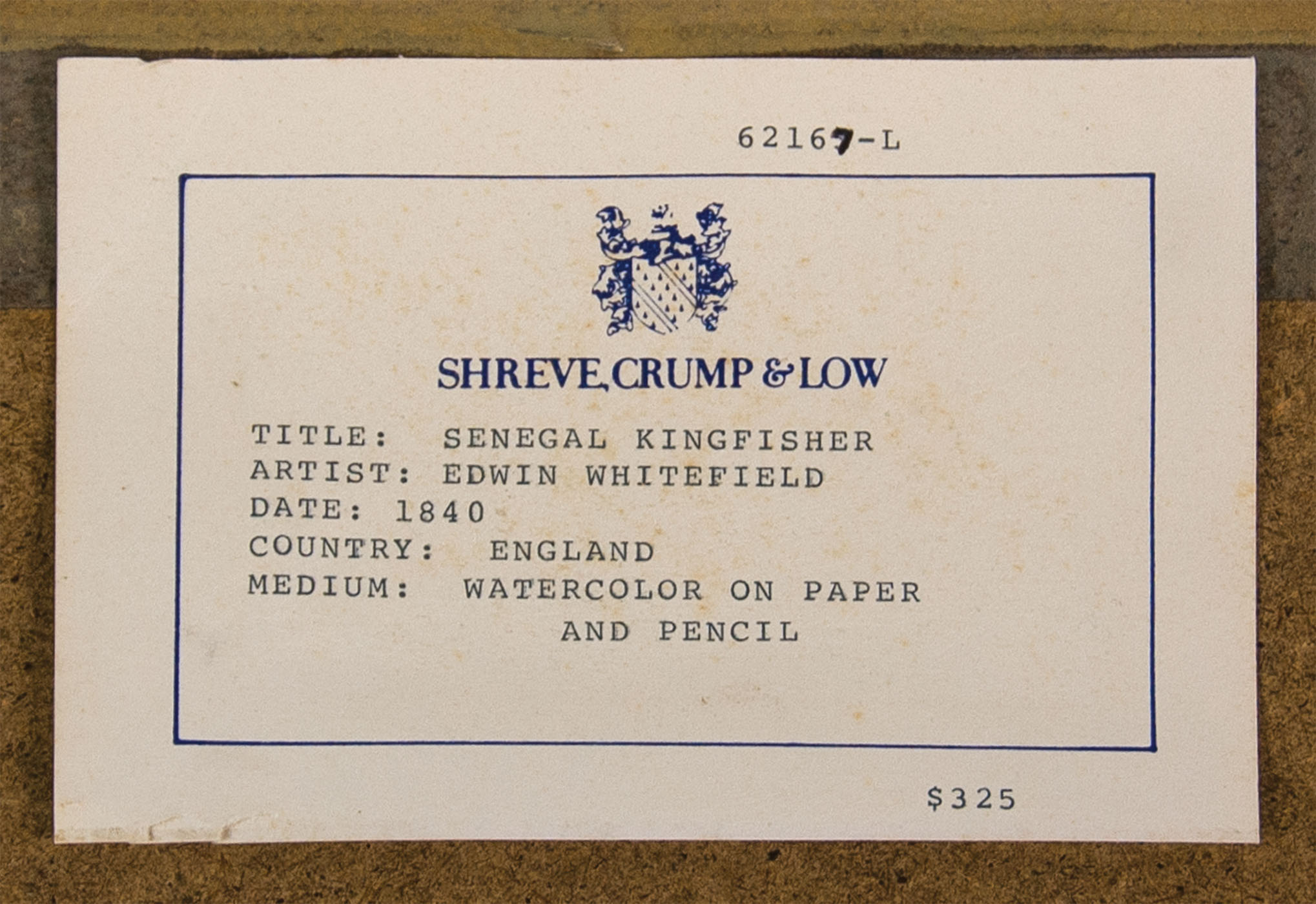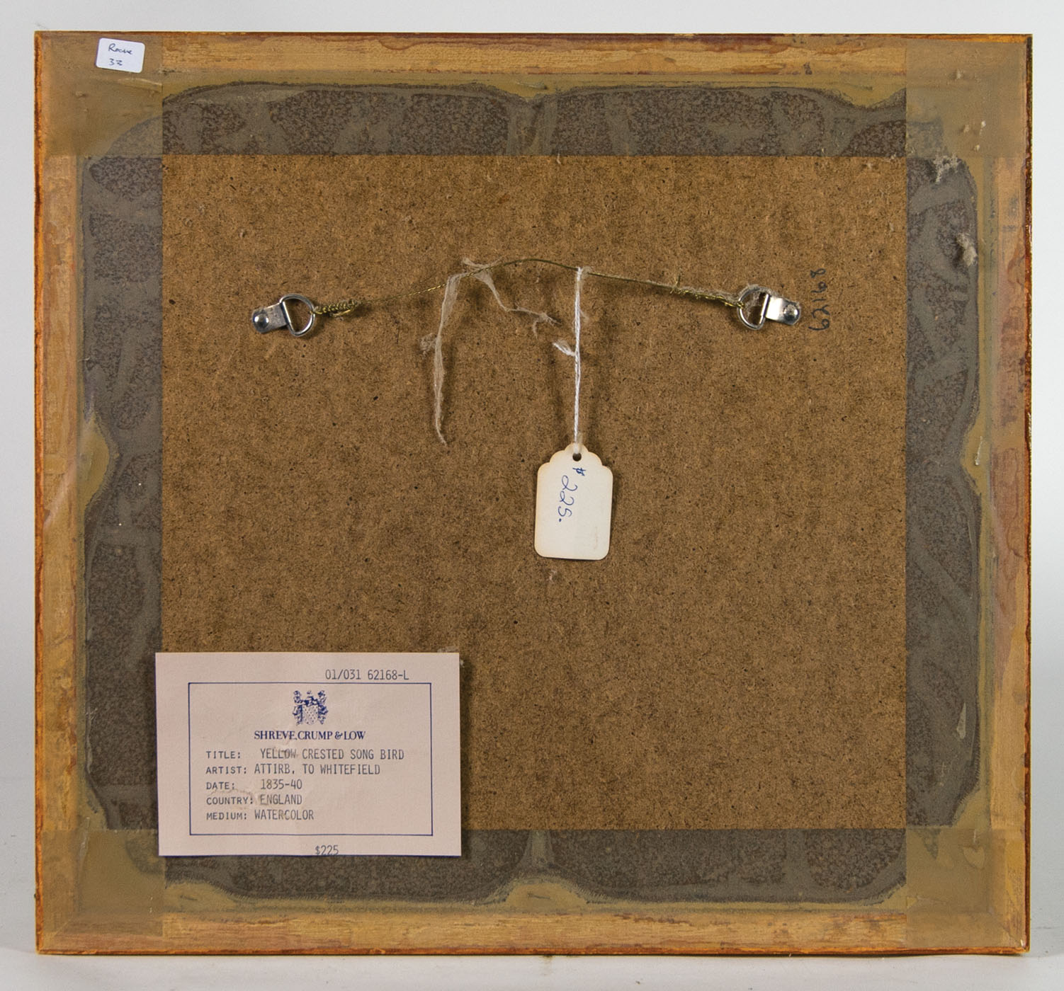 Lithograph titled “Artic Skua” after Selby (Prideaux John Selby, UK, 1788-1867), c. 1819, excellent condition, 16 1/2″ x 22″ (sight); Two pencil and watercolor studies attributed to Edwin Whitefield (Massachusetts/England, 1816-1892), titled “Senegal Kingfisher” and “Yellow Crested Song Bird”, bird's-eye maple veneer frames, 7 3/4″ x 6 3/4″ (sight); from the Roche family of Norwell, MA.